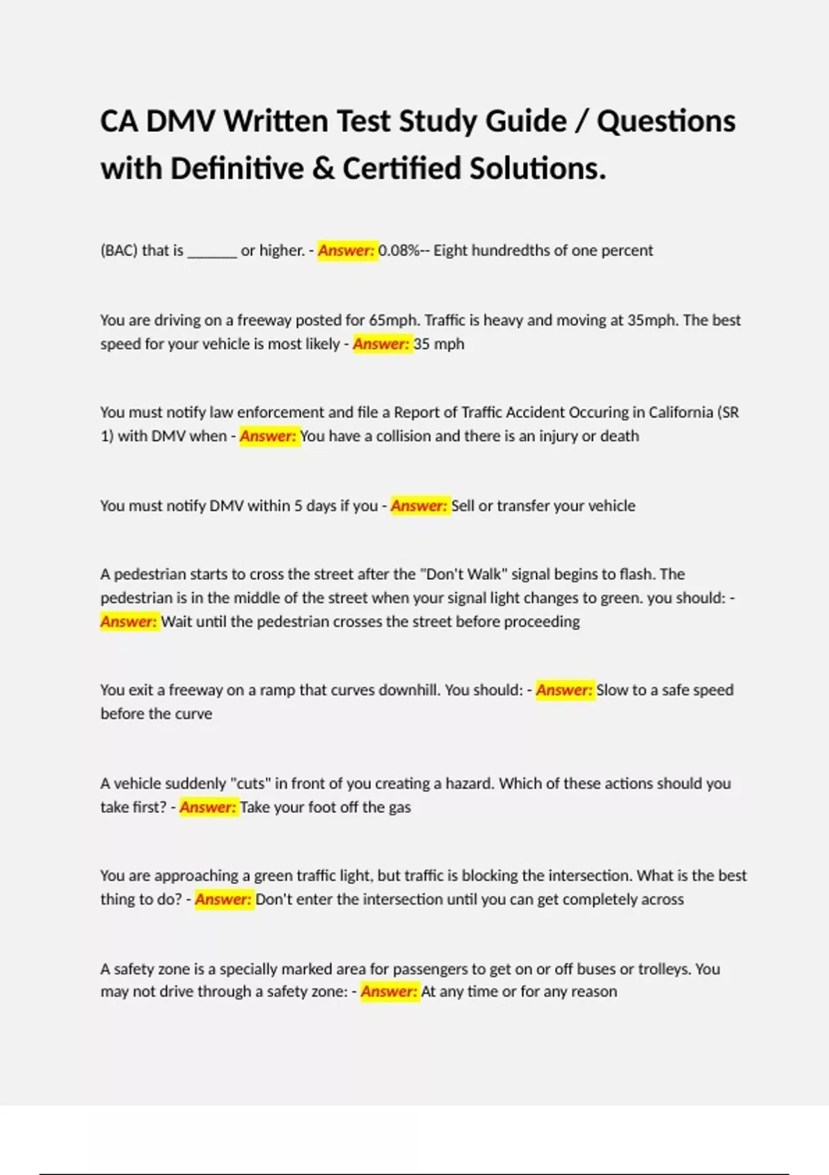 CA DMV Written Test Study Guide / Questions with Definitive & Certified Solutions.