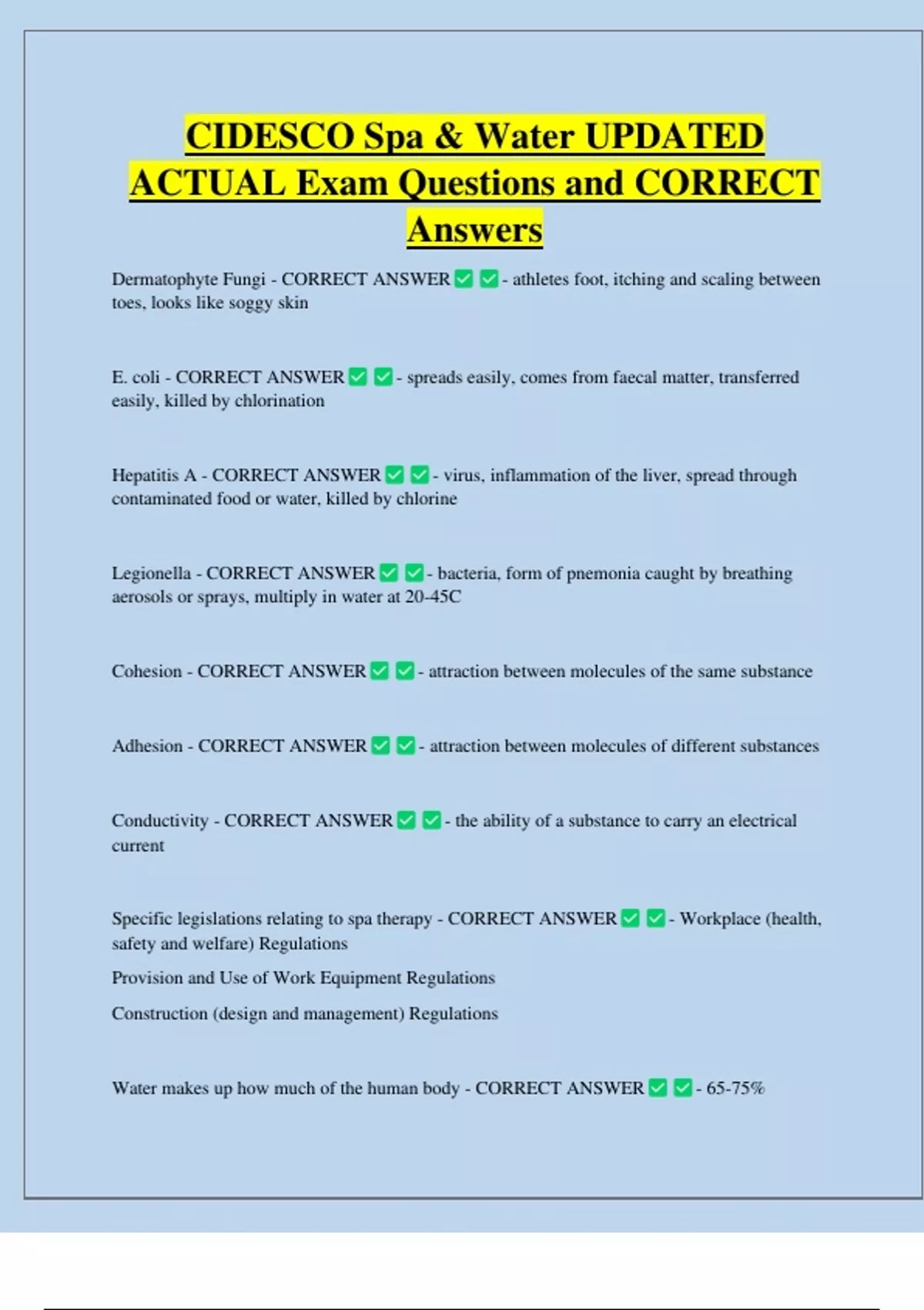 CIDESCO Spa & Water UPDATED ACTUAL Exam Questions and CORRECT Answers Dermatophyte Fungi - CORRECT ANSWER toes, looks like soggy skin E. coli - CORRECT ANSWER - athletes foot, itching and scaling between - spreads easily, comes from faecal matter, transferred easily, killed by chlorination Hepatitis A - CORRECT ANSWER - virus, inflammation of the liver, spread through contaminated food or water, killed by chlorine Legionella - CORRECT ANSWER - bacteria, form of pnemonia caught by breathing