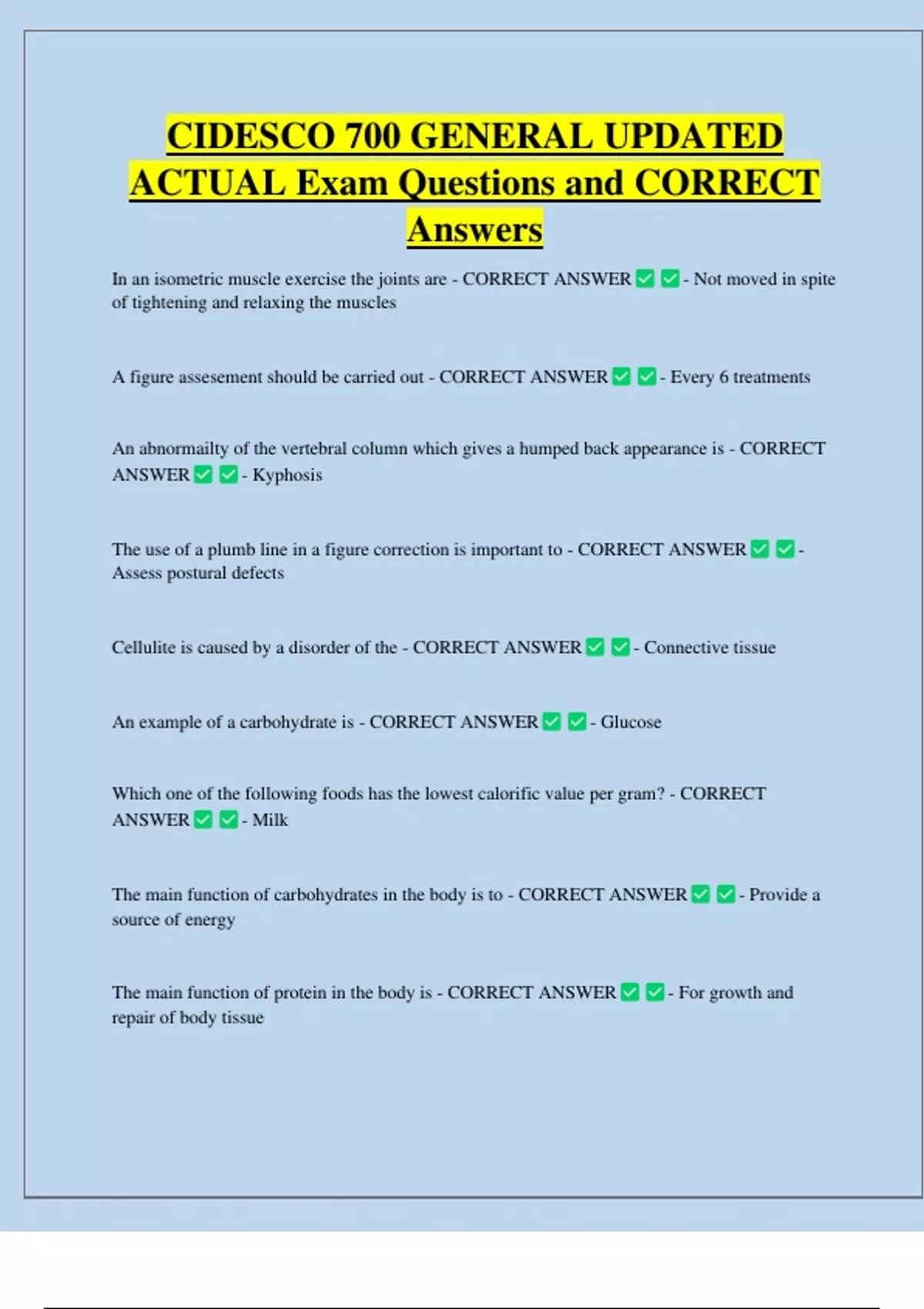 CIDESCO 700 GENERAL UPDATED ACTUAL Exam Questions and CORRECT Answers In an isometric muscle exercise the joints are - CORRECT ANSWER of tightening and relaxing the muscles A figure assesement should be carried out - CORRECT ANSWER - Not moved in spite - Every 6 treatments An abnormailty of the vertebral column which gives a humped back appearance is - CORRECT ANSWER - Kyphosis The use of a plumb line in a figure correction is important to - CORRECT ANSWER