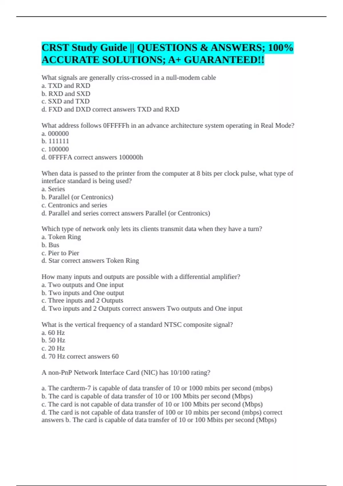 What signals are generally criss-crossed in a null-modem cable a. TXD and RXD b. RXD and SXD c. SXD and TXD d. FXD and DXD correct answers TXD and RXD What address follows 0FFFFFh in an advance architecture system operating in Real Mode? a. 000000 b. 111111 c. 100000 d. 0FFFFA correct answers 100000h When data is passed to the printer from the computer at 8 bits per clock pulse, what type of interface standard is being used? a. Series b. Parallel (or Centronics) c. Centronics and series d. Parallel and series correct answers Parallel (or Centronics) Which type of network only lets its clients transmit data when they have a turn? a. Token Ring b. Bus c. Pier to Pier d. Star correct answers Token Ring How many inputs and outputs are possible with a differential amplifier? a. Two outputs and One input b. Two inputs and One output c. Three inputs and 2 Outputs d. Two inputs and 2 Outputs correct answers Two outputs and One input What is the vertical frequency of a standard NTSC composite signal? a. 60 Hz b. 50 Hz c. 20 Hz d. 70 Hz correct answers 60 A non-PnP Network Interface Card (NIC) has 10/100 rating? a. The cardterm-7 is capable of data transfer of 10 or 1000 mbits per second (mbps) b. The card is capable of data transfer of 10 or 100 Mbits per second (Mbps) c. The card is not capable of data transfer of 10 or 100 Mbits per second (Mbps) d. The card is not capable of data transfer of 100 or 10 mbits per second (mbps) correct answers b. The card is capable of data transfer of 10 or 100 Mbits per second (Mbps)