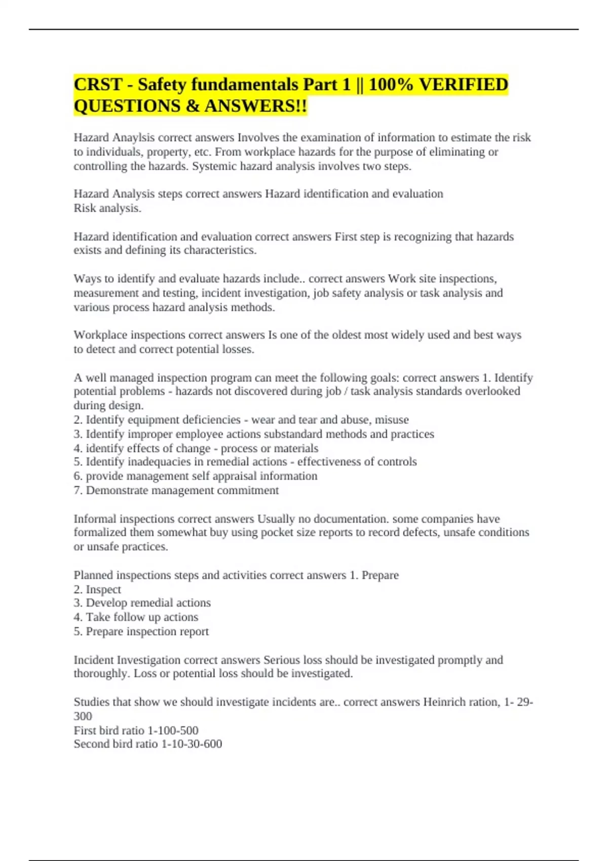 Incident Investigation correct answers Serious loss should be investigated promptly and