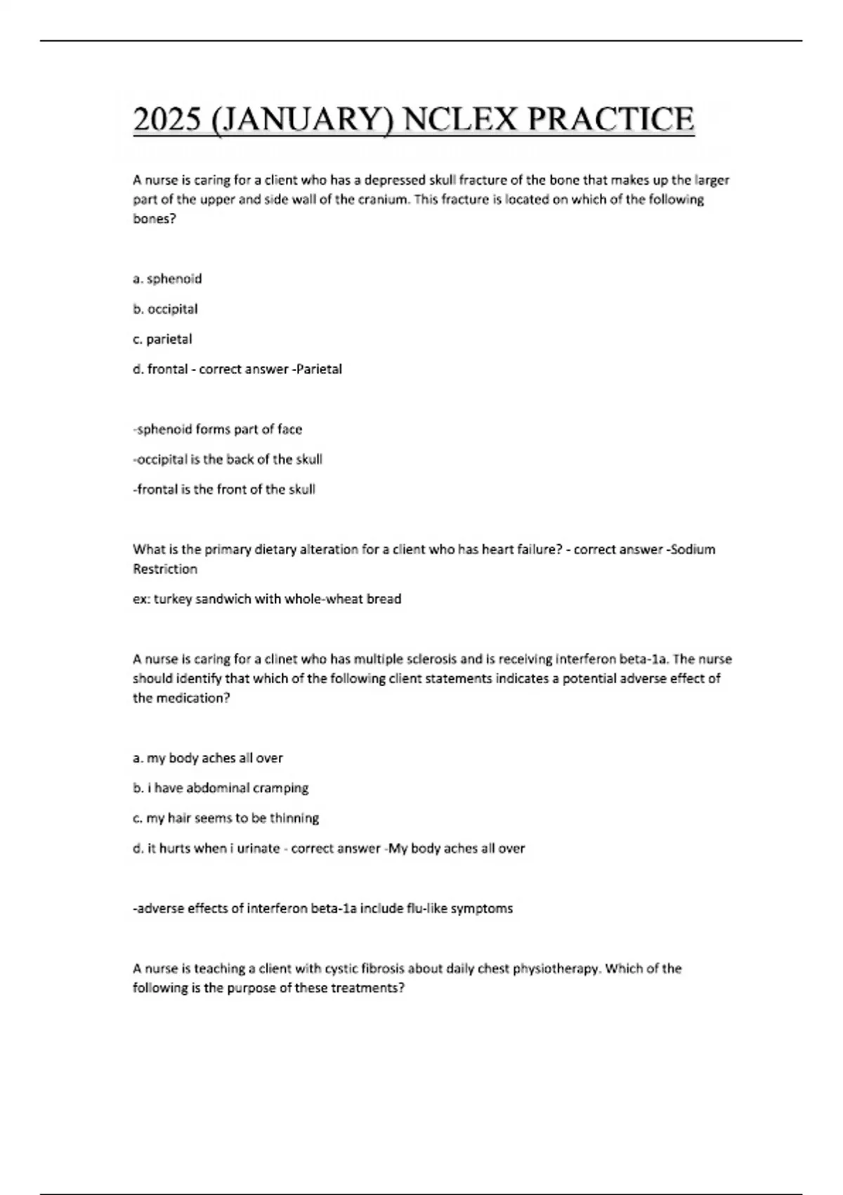 2025 (JANUARY) NCLEX PRACTICE A nurse is caring for a client who has a depressed skull fracture of the bone that makes up the larger part of the upper and side wall of the cranium. This fracture is located on which of the following bones? a. sphenoid b. occipital c. parietal d. frontal - correct answer -Parietal -sphenoid forms part of face -occipital is the back of the skull -frontal is the front of the skull What is the primary dietary alteration for a client who has heart failure? - correct answer -Sodium Restriction ex: turkey sandwich with whole-wheat bread A nurse is caring for a clinet who has multiple sclerosis and is receiving interferon beta-1a. The nurse should identify that which of the following client statements indicates a potential adverse effect of the medication? a. my body aches all over b. i have abdominal cramping c. my hair seems to be thinning d. it hurts when i urinate - correct answer -My body aches all over -adverse effects of interferon beta-1a include flu-like symptoms A nurse is teaching a client with cystic fibrosis about daily chest physiotherapy. Which of the following is the purpose of these treatments? a. to encourage deep breaths b. to mobilize secretions in the airways c. to dilate the bronchioles d. to stimulate the cough reflex - correct answer -To mobilize secretions in the airway