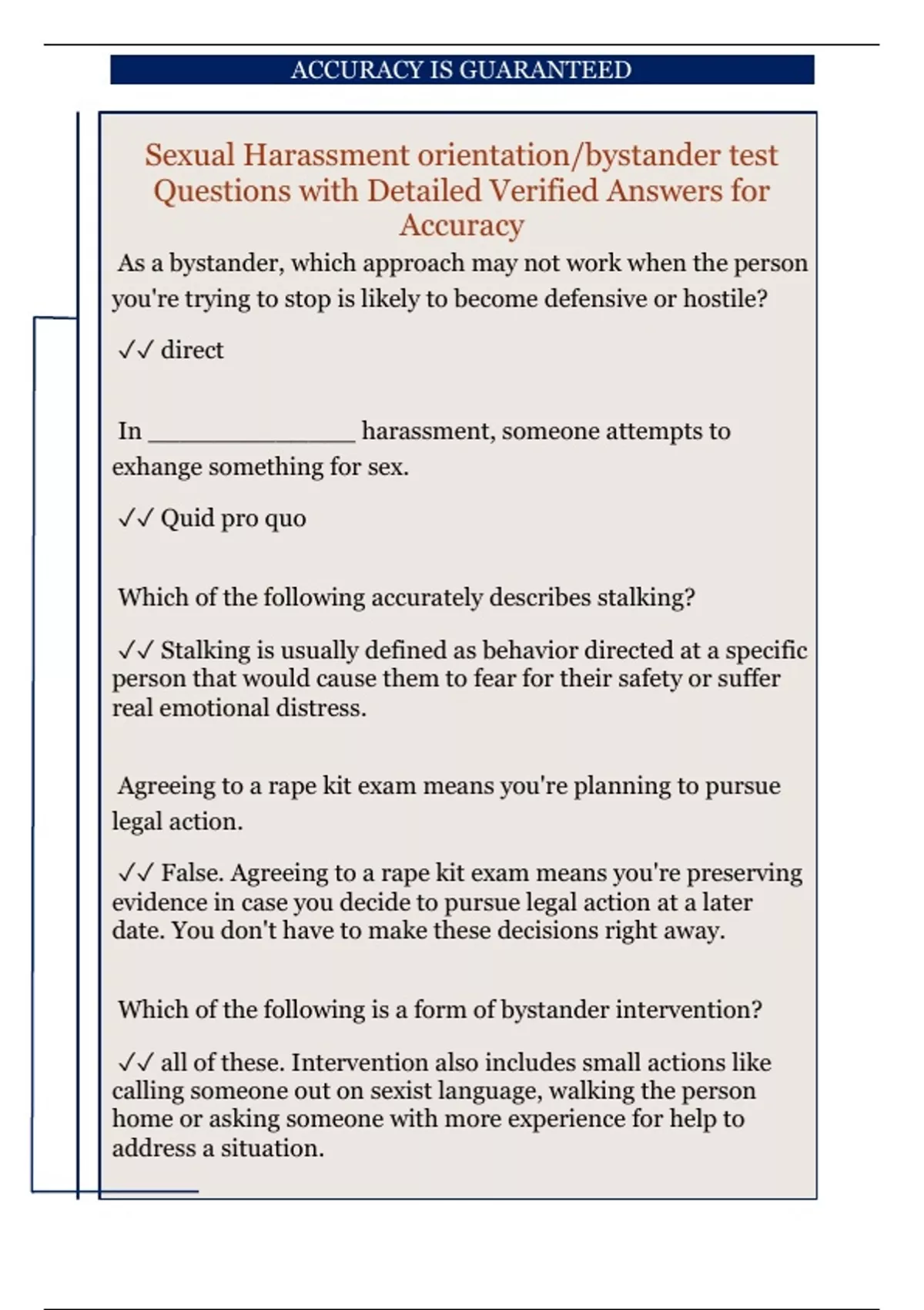Sexual Harassment orientation/bystander test Questions with Detailed Verified Answers for Accuracy
