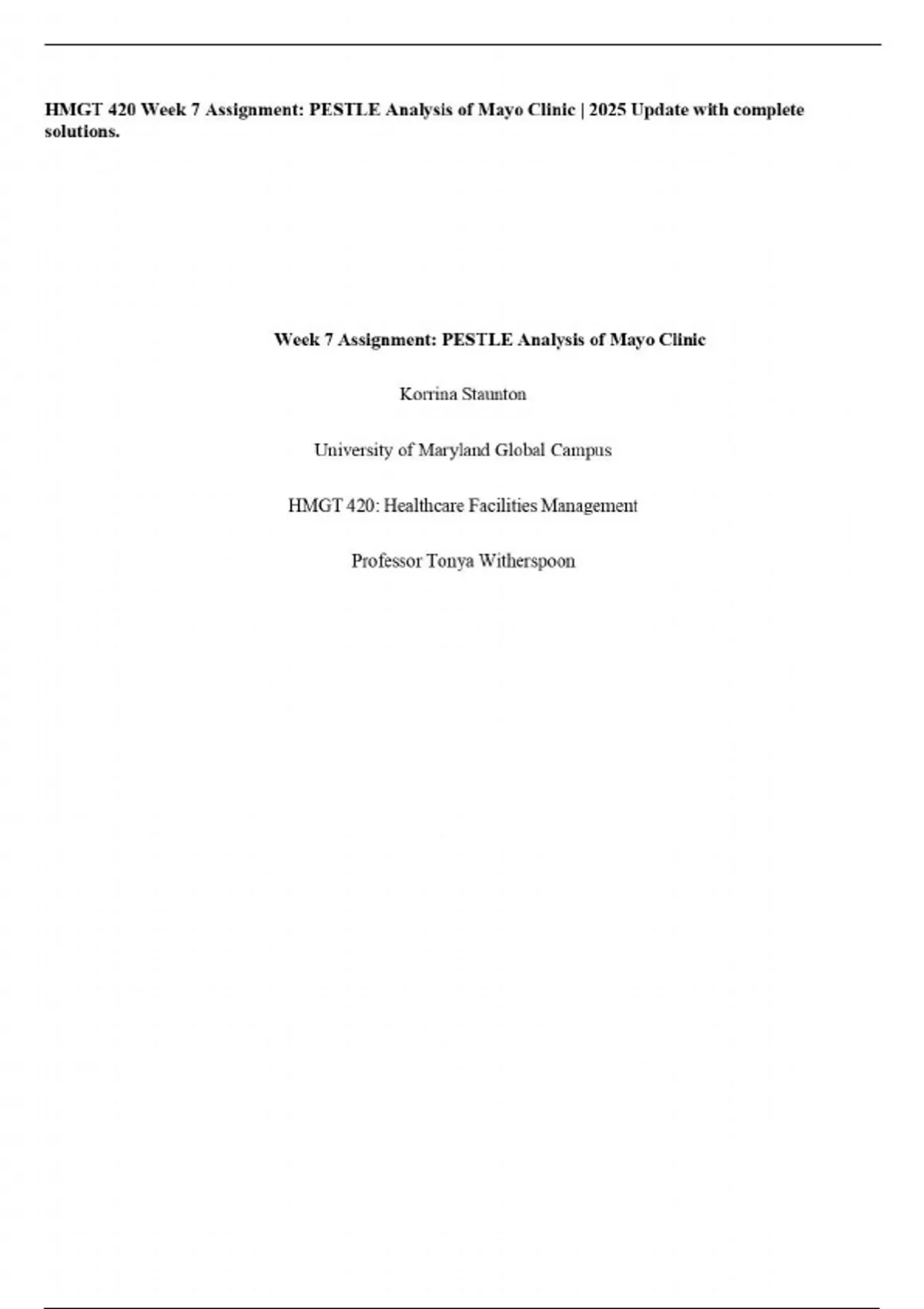 HMGT 420 Week 7 Assignment: PESTLE Analysis of Mayo Clinic | 2025 Update with complete solutions.