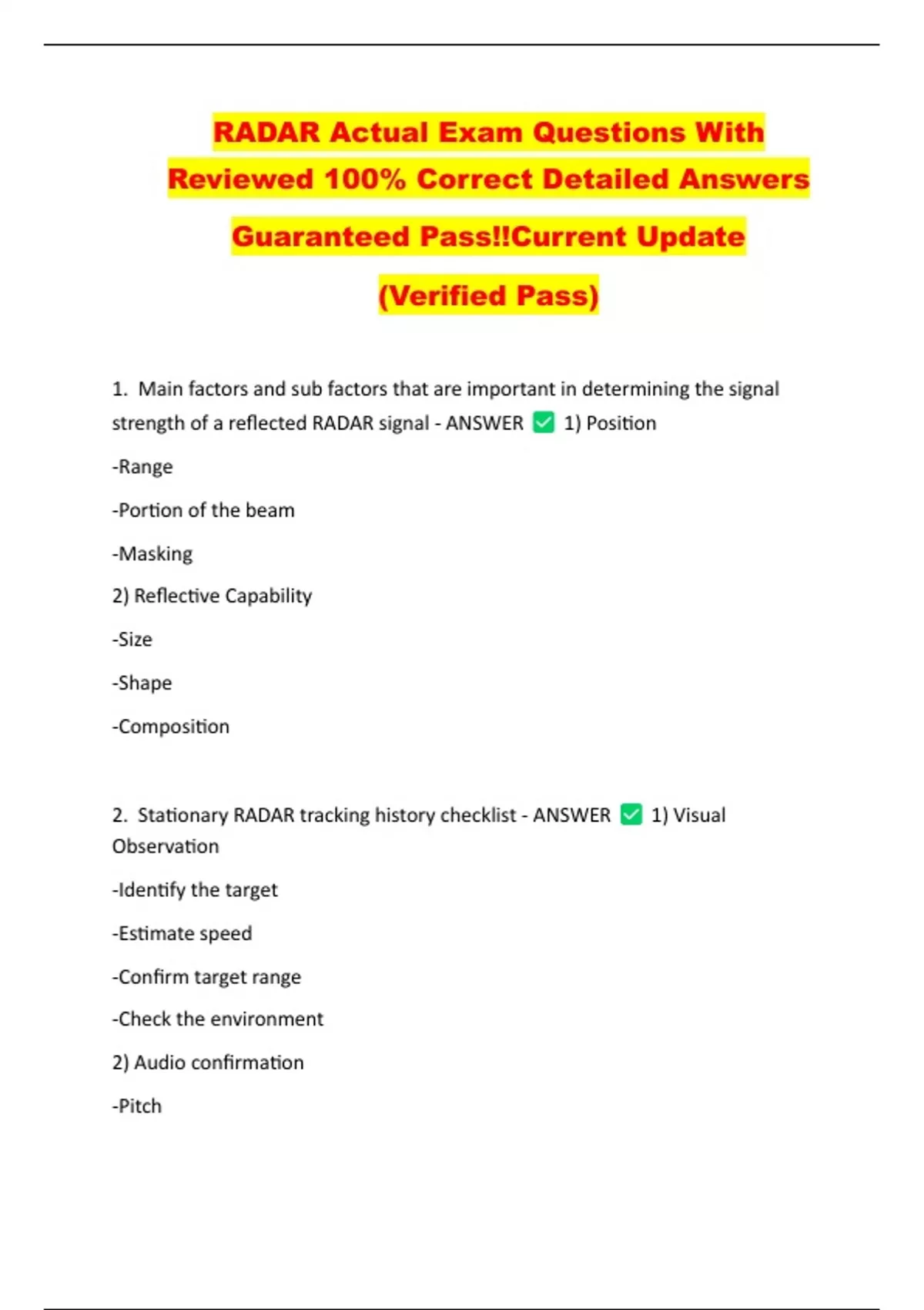 RADAR Actual Exam Questions With Reviewed 100% Correct Detailed Answers Guaranteed Pass!!Current Update (Verified Pass) 1. Main factors and sub factors that are important in determining the signal strength of a reflected RADAR signal - ANSWER 1) Position -Range -Portion of the beam -Masking 2) Reflective Capability -Size -Shape -Composition 2. Stationary RADAR tracking history checklist - ANSWER Observation -Identify the target -Estimate speed -Confirm target range -Check the environment 2) Audio confirmation 1) Visual -Pitch -Clarity 3) RADAR verification -Stable reading of at least 3 seconds -Manual lock if desired 3. Stationary RADAR defined - ANSWER Stationary RADAR transmits a beam of microwave energy traveling at the speed of light (186,282 miles/second). A portion of the beam reflects off objects in its path and returns to the RADAR. The frequency of the beam will be changed in proportion to the speed of the reflecting object. The RADAR compares the received signal with the transmitted signal determining the speed of the vehicle by the amount of the frequency change. 4. Describe the Doppler Principle - ANSWER -The frequency of a wave is relative to the motion between the source and the observer 5. Originally applies only to sound waves, now applies to: 1) Sound waves 2) Radio waves 3) Light waves 6. What is the K-band Doppler frequency for 1MPH? - ANSWER 72 cycles per second 7. What is the Ka-band Doppler frequency for 1MPH? - ANSWER 102.9 cycler per second