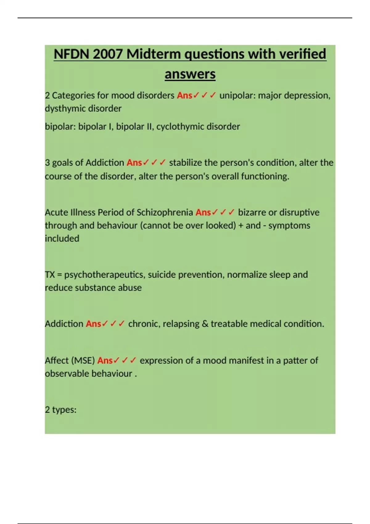 2 Categories for mood disorders Ans✓✓✓ unipolar: major depression,
