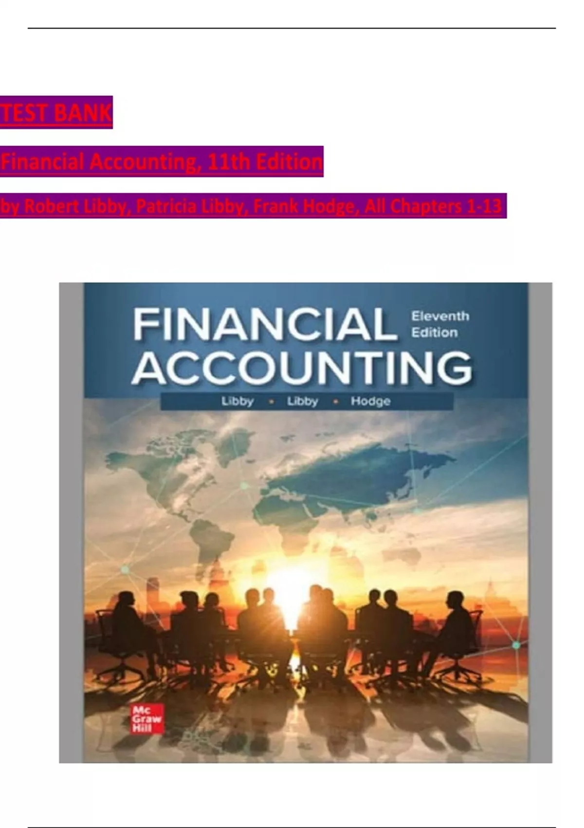 This document contains the full test bank for Financial Accounting (11th Edition) by Robert Libby, Patricia Libby, and Frank Hodge. It includes comprehensive multiple-choice questions and answers for Chapters 1 through 13, covering essential topics such as the accounting cycle, financial statements, internal controls, and key financial metrics. Perfect for exam review, homework support, and mastering accounting fundamentals.This document contains the full test bank for Financial Accounting (11th Edition) by Robert Libby, Patricia Libby, and Frank Hodge. It includes comprehensive multiple-choice questions and answers for Chapters 1 through 13, covering essential topics such as the accounting cycle, financial statements, internal controls, and key financial metrics. Perfect for exam review, homework support, and mastering accounting fundamentals.