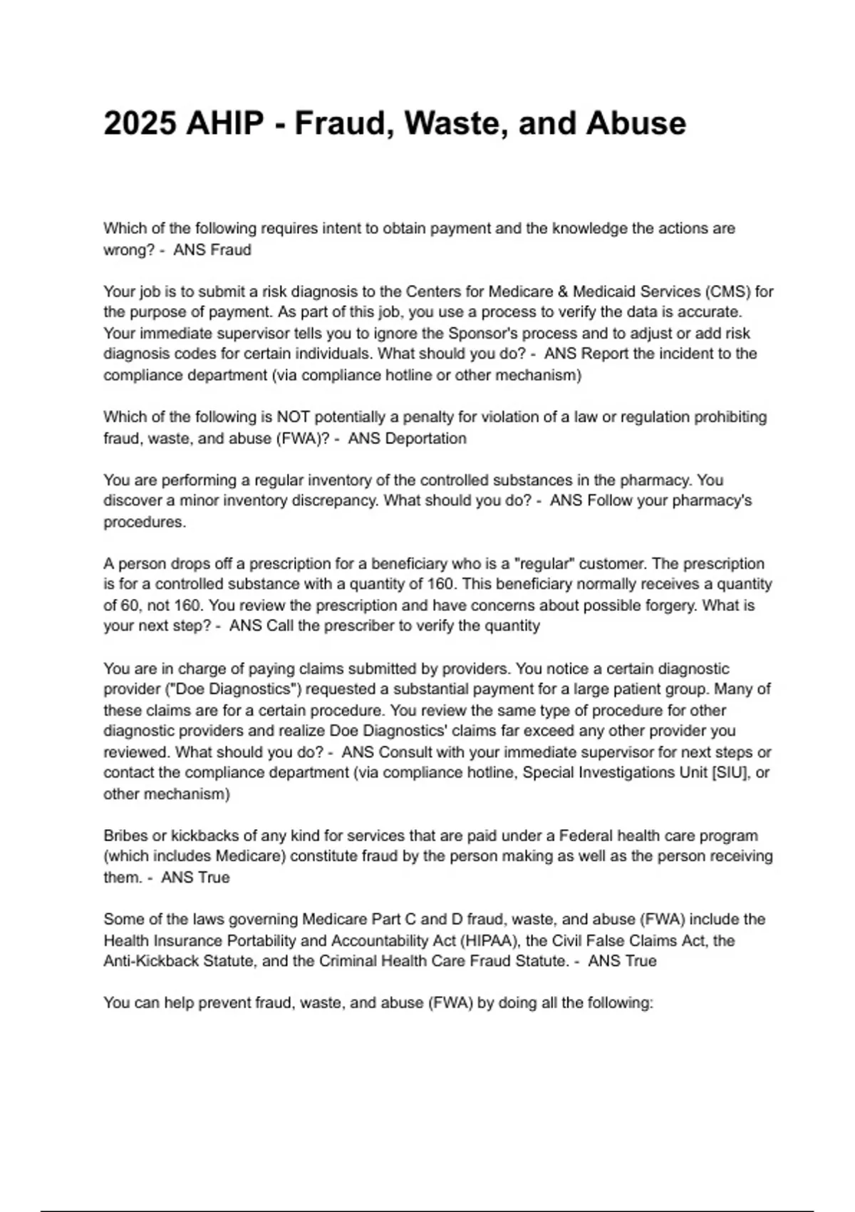 You can help prevent fraud, waste, and abuse (FWA) by doing all the following:
