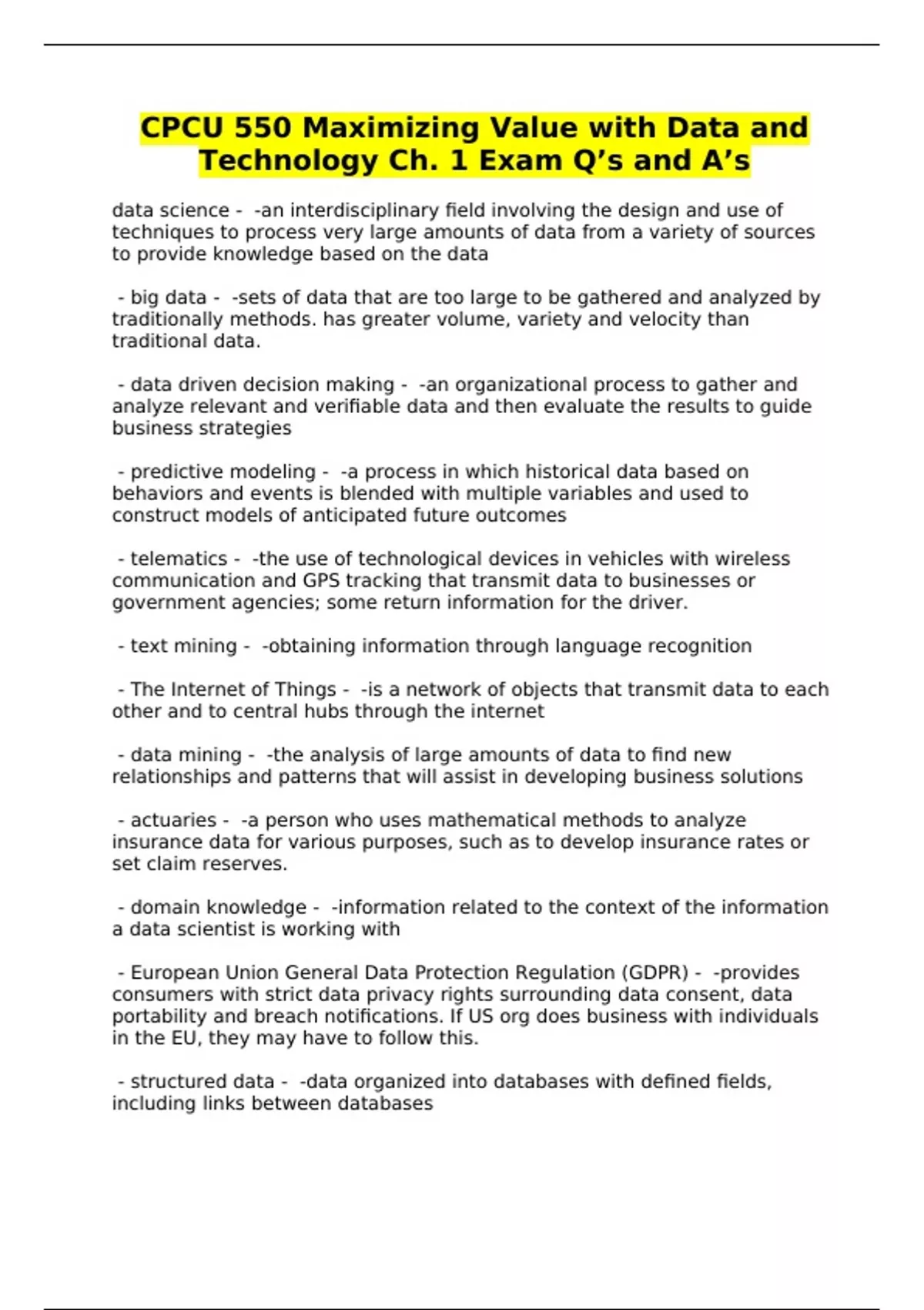 CPCU 550 Maximizing Value with Data and Technology Ch. 1 Exam Q’s and A’s