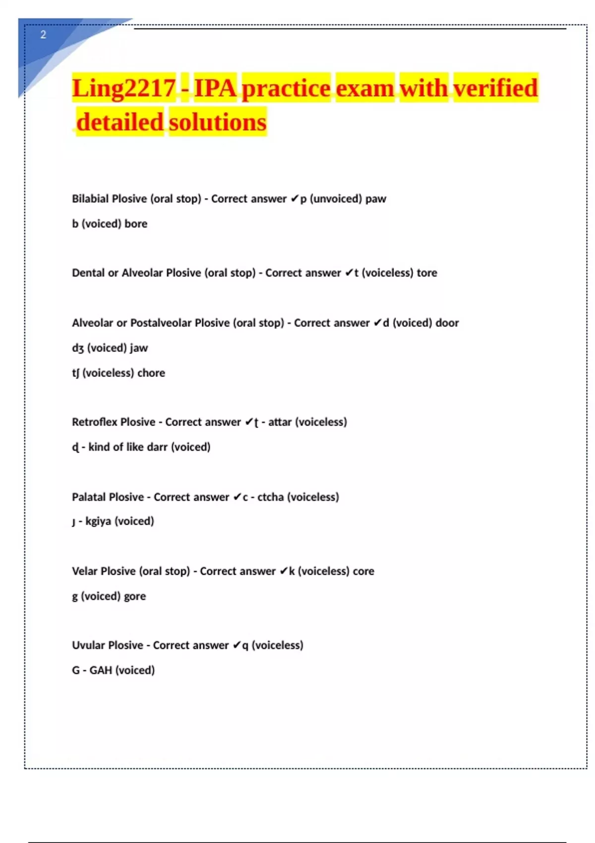 Bilabial Plosive (oral stop) - Correct answer ✔p (unvoiced) paw|||||| |||||| |||||| |||||| |||||| |||||| |||||| |||||| ||||||