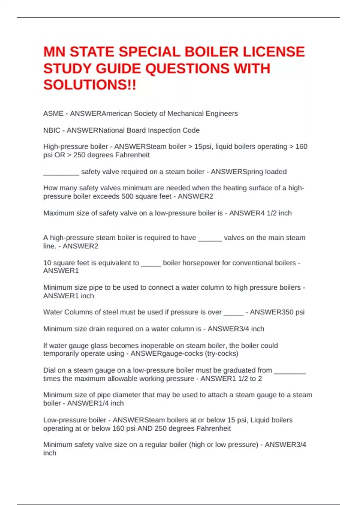 MN STATE SPECIAL BOILER LICENSE STUDY GUIDE QUESTIONS WITH SOLUTIONS!!