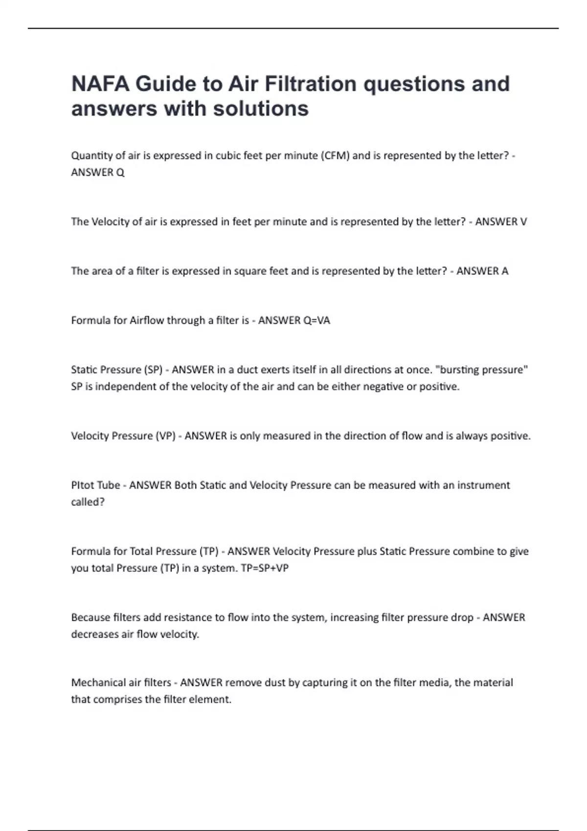 Formula for Airflow through a filter is - ANSWER Q=VA