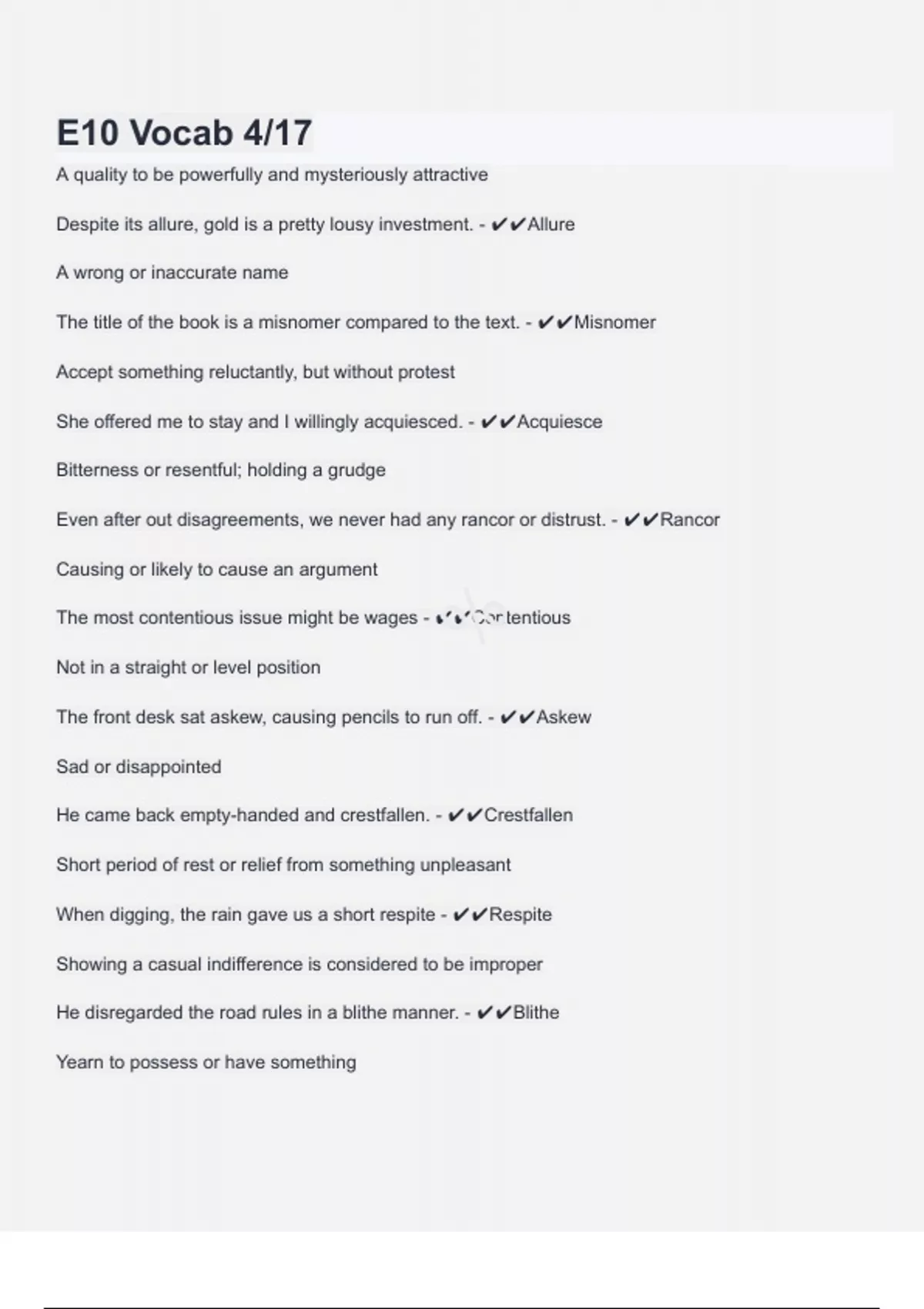 E10 Vocab 4/17 A quality to be powerfully and mysteriously attractive Despite its allure, gold is a pretty lousy investment. - Allure A wrong or inaccurate name The title of the book is a misnomer compared to the text. - Misnomer Accept something reluctantly, but without protest She offered me to stay and I willingly acquiesced. - Acquiesce Bitterness or resentful; holding a grudge Even after out disagreements, we never had any rancor or distrust. - Rancor Causing or likely to cause an argument The most contentious issue might be wages - Contentious Not in a straight or level position The front desk sat askew, causing pencils to run off. - Askew Sad or disappointed He came back empty-handed and crestfallen. - Crestfallen Short period of rest or relief from something unpleasant When digging, the rain gave us a short respite - Respite Showing a casual indifference is considered to be improper He disregarded the road rules in a blithe manner. - Blithe Yearn to possess or have something % I constantly covet to rare shoes. - Covet