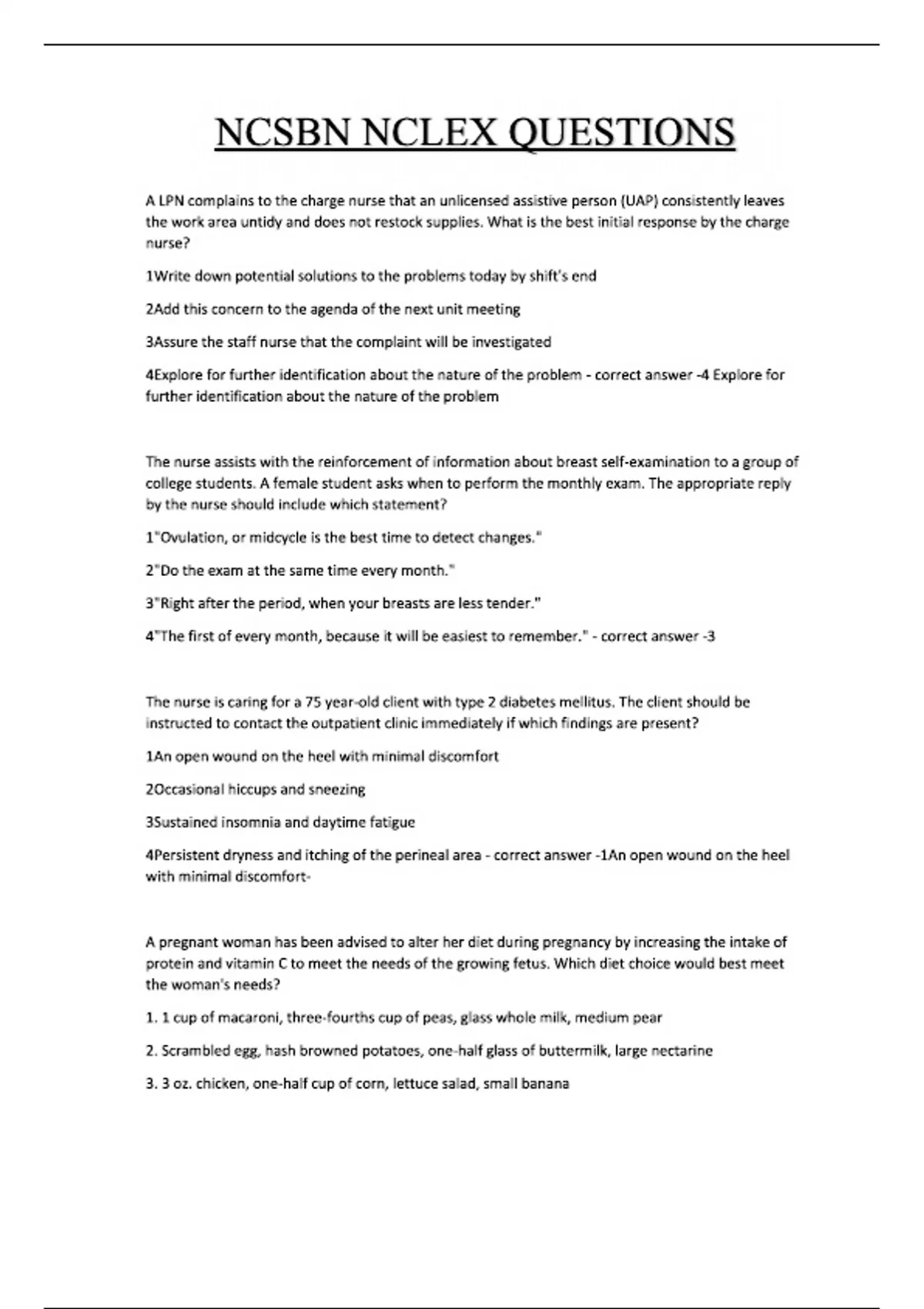NCSBN NCLEX QUESTIONS A LPN complains to the charge nurse that an unlicensed assistive person (UAP) consistently leaves the work area untidy and does not restock supplies. What is the best initial response by the charge nurse? 1Write down potential solutions to the problems today by shift's end 2Add this concern to the agenda of the next unit meeting 3Assure the staff nurse that the complaint will be investigated 4Explore for further identification about the nature of the problem - correct answer -4 Explore for further identification about the nature of the problem The nurse assists with the reinforcement of information about breast self-examination to a group of college students. A female student asks when to perform the monthly exam. The appropriate reply by the nurse should include which statement? 1"Ovulation, or midcycle is the best time to detect changes." 2"Do the exam at the same time every month." 3"Right after the period, when your breasts are less tender." 4"The first of every month, because it will be easiest to remember." - correct answer -3 The nurse is caring for a 75 year-old client with type 2 diabetes mellitus. The client should be instructed to contact the outpatient clinic immediately if which findings are present? 1An open wound on the heel with minimal discomfort 2Occasional hiccups and sneezing 3Sustained insomnia and daytime fatigue 4Persistent dryness and itching of the perineal area - correct answer -1An open wound on the heel with minimal discomfortA pregnant woman has been advised to alter her diet during pregnancy by increasing the intake of protein and vitamin C to meet the needs of the growing fetus. Which diet choice would best meet the woman's needs? 1. 1 cup of macaroni, three-fourths cup of peas, glass whole milk, medium pear 2. Scrambled egg, hash browned potatoes, one-half glass of buttermilk, large nectarine 3. 3 oz. chicken, one-half cup of corn, lettuce salad, small banana4. Beef, one-half cup of lima beans, glass of skim milk, three-fourths cup of strawberries - correct answer -4. Beef, one-half cup of lima beans, glass of skim milk, three-fourths cup of strawberries - A nurse is taking a health history from parents of a child admitted with possible Reye's syndrome. Which recent illness should the nurse recognize as being associated with an increased the risk for the development of Reye's syndrome? 1. Varicella 2. Meningitis 3. Hepatitis 4. Rubeola - correct answer -1. Varicella - A Native American chief visits his newborn son and performs a traditional ceremony that involves feathers and chanting. The nurse comments to a colleague: "I wonder if he has any idea how ridiculous he looks - he's a grown man!" The nurse's comment is an example of what type of attitude? 1. Prejudice 2. Ethnocentrism 3. Discrimination 4. Stereotyping - correct answer -1. PrejudiceA nursing student asks the licensed practical nurse (LPN) to explain the forces that drive health care reform. When responding to the student's question, what information should the nurse emphasize? 1. Increased competition between health care insurers 2. Increase in health care spending that's growing faster than the economy 3. Increase in the population who have health insurance 4. Increase in spending for end-of-life treatment - correct answer -2 A child is admitted to the unit with the suspected diagnosis of pertussis (whooping cough). What is the priority nursing intervention for this child? 1. Maintain hydration and encourage fluids 2. Implement droplet precautions 3. Monitor respiratory rate and oxygen saturation 4. Anti- infective therapy - correct answer -2A client has an indwelling catheter with continuous bladder irrigation after undergoing a transurethral resection of the prostate (TURP) 12 hours ago. Which finding at this time should be reported to the registered nurse (RN) charge nurse? 1Complaints for the feeling of pulling on the urinary catheter 2Light, pink to clear urine 3Occasional suprapubic cramping 4Minimal drainage into the urinary collection bag - correct answer -4Minimal drainage into the urinary collection bag A nurse is caring for a woman two hours after a vaginal delivery. Documentation indicates that the membranes ruptured 36 hours prior to delivery. Which of these nursing diagnoses should the nurse expect the charge nurse to list as a priority at this time? 1Risk for fluid volume deficit 2Risk for excessive bleeding 3Risk for infection - 4Altered tissue perfusion - correct answer -3 A 14 month-old child ingests a half a bottle of baby aspirin (81 mg) tablets. Which finding should a nurse expect to see in the child? 1Hypothermia 2Nausea and vomiting 3Hypoventilation 4Bradycardia - correct answer -2 A school nurse monitors a child with a history of tonic-clonic seizures. The school nurse should inform teachers that if the child falls to the floor and experiences a seizure while in the classroom, which of the following would be the most important action to take during the seizure? 1Place the hands or a folded blanket under the head of the child 2Provide privacy as much as possible to minimize frightening the other children 3Move any chairs or desks at least three feet away from the child 4Note the sequence of movements with the time lapse of the event - correct answer -1Place the hands or a folded blanket under the head of the child -A client is admitted with diagnosis of a right upper lobe infiltrate and to rule out active tuberculosis (TB). Which type of precautions will be needed for this client? 1Droplet 2Contact 3Standard 4Airborne - correct answer -4 A client has had a positive reaction to purified protein derivative (PPD). Which statement made by the client suggests the client understands the teaching by the registered nurse (RN)? 1"I have active tuberculosis." 2"I have been exposed to mycobacterium tuberculosis." 3"I have never been infected with mycobacterium tuberculosis." 4"I have never had tuberculosis." - correct answer -2 A nurse is caring for a client w