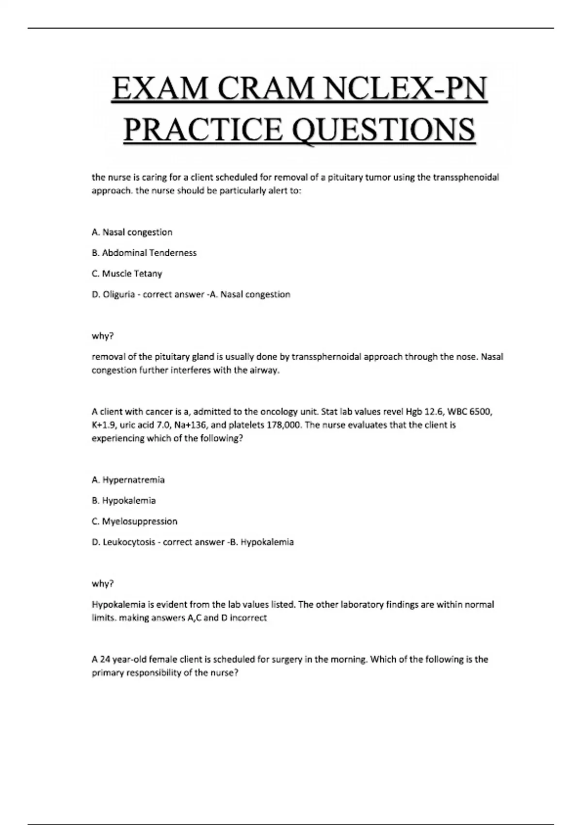 EXAM CRAM NCLEX-PN PRACTICE QUESTIONS the nurse is caring for a client scheduled for removal of a pituitary tumor using the transsphenoidal approach. the nurse should be particularly alert to: A. Nasal congestion B. Abdominal Tenderness C. Muscle Tetany D. Oliguria - correct answer -A. Nasal congestion why? removal of the pituitary gland is usually done by transsphernoidal approach through the nose. Nasal congestion further interferes with the airway. A client with cancer is a, admitted to the oncology unit. Stat lab values revel Hgb 12.6, WBC 6500, K+1.9, uric acid 7.0, Na+136, and platelets 178,000. The nurse evaluates that the client is experiencing which of the following? A. Hypernatremia B. Hypokalemia C. Myelosuppression D. Leukocytosis - correct answer -B. Hypokalemia why? Hypokalemia is evident from the lab values listed. The other laboratory findings are within normal limits. making answers A,C and D incorrect A 24 year-old female client is scheduled for surgery in the morning. Which of the following is the