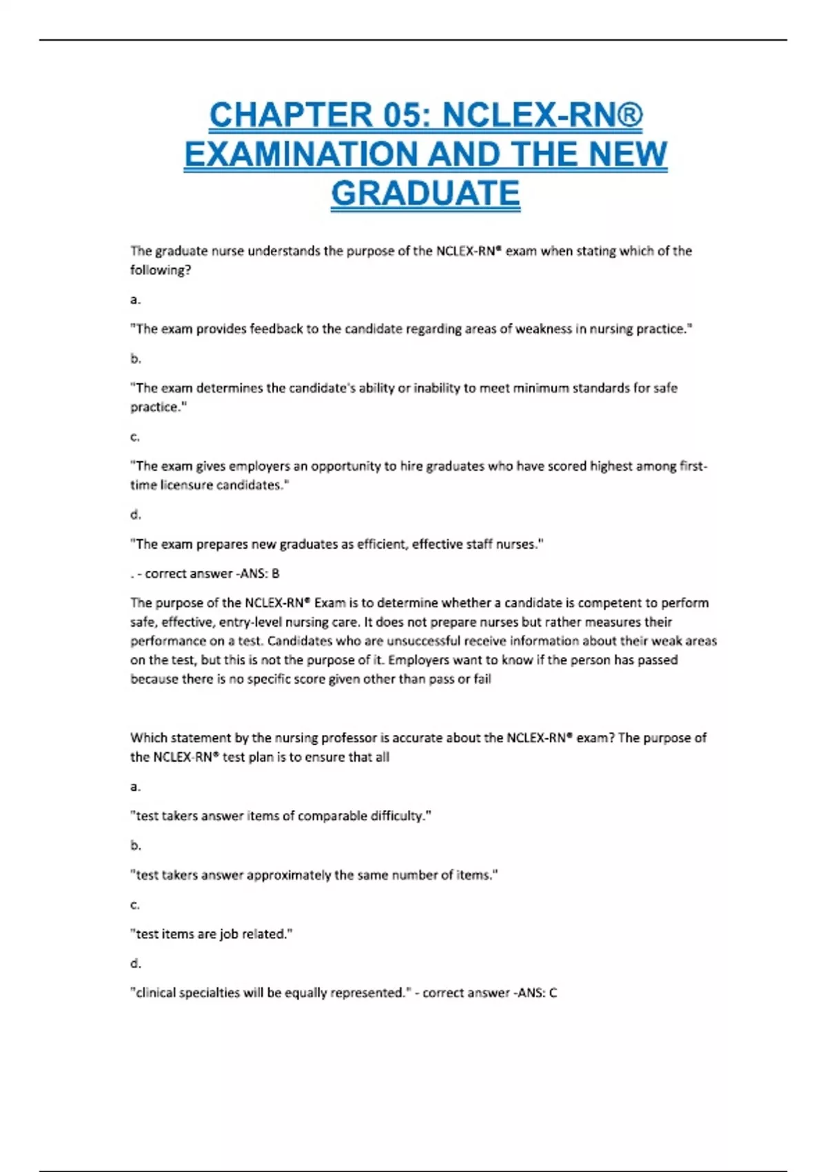 CHAPTER 05: NCLEX-RN® EXAMINATION AND THE NEW GRADUATE The graduate nurse understands the purpose of the NCLEX-RN® exam when stating which of the following? a. "The exam provides feedback to the candidate regarding areas of weakness in nursing practice." b. "The exam determines the candidate's ability or inability to meet minimum standards for safe practice." c. "The exam gives employers an opportunity to hire graduates who have scored highest among firsttime licensure candidates." d. "The exam prepares new graduates as efficient, effective staff nurses." . - correct answer -ANS: B The purpose of the NCLEX-RN® Exam is to determine whether a candidate is competent to perform safe, effective, entry-level nursing care. It does not prepare nurses but rather measures their performance on a test. Candidates who are unsuccessful receive information about their weak areas on the test, but this is not the purpose of it. Employers want to know if the person has passed because there is no specific score given other than pass or fail Which statement by the nursing professor is accurate about the NCLEX-RN® exam? The purpose of the NCLEX-RN® test plan is to ensure that all a. "test takers answer items of comparable difficulty." b. "test takers answer approximately the same number of items." c. "test items are job related." d. "clinical specialties will be equally represented." - correct answer -ANS: