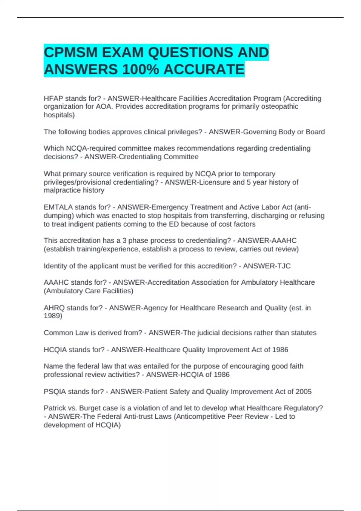 CPMSM EXAM QUESTIONS AND ANSWERS 100% ACCURATE CPMSM EXAM QUESTIONS AND ANSWERS 100% ACCURATE CPMSM EXAM QUESTIONS AND ANSWERS 100% ACCURATE HFAP stands for? - ANSWER-Healthcare Facilities Accreditation Program (Accrediting organization for AOA. Provides accreditation programs for primarily osteopathic hospitals) The following bodies approves clinical privileges? - ANSWER-Governing Body or Board Which NCQA-required committee makes recommendations regarding credentialing decisions? - ANSWER-Credentialing Committee What primary source verification is required by NCQA prior to temporary privileges/provisional credentialing? - ANSWER-Licensure and 5 year history of malpractice history EMTALA stands for? - ANSWER-Emergency Treatment and Active Labor Act (anti-dumping) which was enacted to stop hospitals from transferring, discharging or refusing