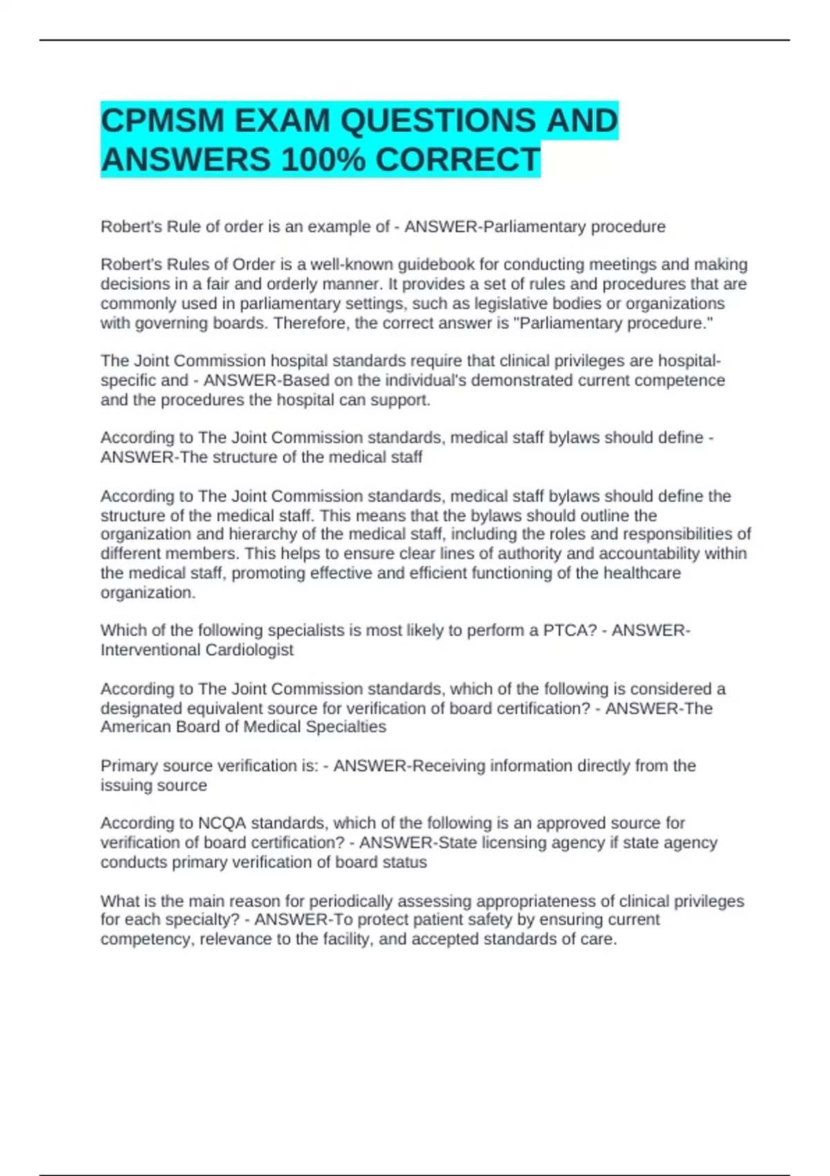 CPMSM EXAM QUESTIONS AND ANSWERS 100% CORRECTCPMSM EXAM QUESTIONS AND ANSWERS 100% CORRECTCPMSM EXAM QUESTIONS AND ANSWERS 100% CORRECT Robert's Rule of order is an example of - ANSWER-Parliamentary procedure Robert's Rules of Order is a well-known guidebook for conducting meetings and making decisions in a fair and orderly manner. It provides a set of rules and procedures that are commonly used in parliamentary settings, such as legislative bodies or organizations with governing boards. Therefore, the correct answer is "Parliamentary procedure." The Joint Commission hospital standards require that clinical privileges are hospital-specific and - ANSWER-Based on the individual's demonstrated current competence