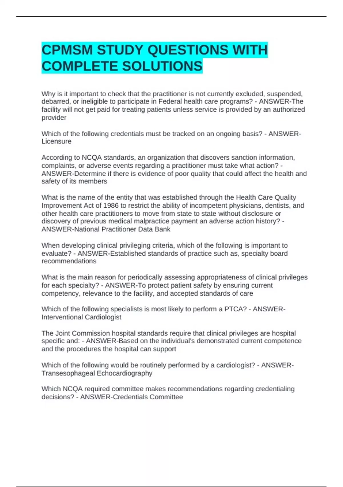CPMSM STUDY QUESTIONS WITH COMPLETE SOLUTIONSCPMSM STUDY QUESTIONS WITH COMPLETE SOLUTIONSCPMSM STUDY QUESTIONS WITH COMPLETE SOLUTIONS Why is it important to check that the practitioner is not currently excluded, suspended, debarred, or ineligible to participate in Federal health care programs? - ANSWER-The facility will not get paid for treating patients unless service is provided by an authorized provider Which of the following credentials must be tracked on an ongoing basis? - ANSWER-Licensure According to NCQA standards, an organization that discovers sanction information, complaints, or adverse events regarding a practitioner must take what action? - ANSWER-Determine if there is evidence of poor quality that could affect the health and safety of its members What is the name of the entity that was established through the Health Care Quality Improvement Act of 1986 to restrict the ability of incompetent physicians, dentists, and other health care practitioners to move from state to state without disclosure or discovery of previous medical malpractice payment an adverse action history? -