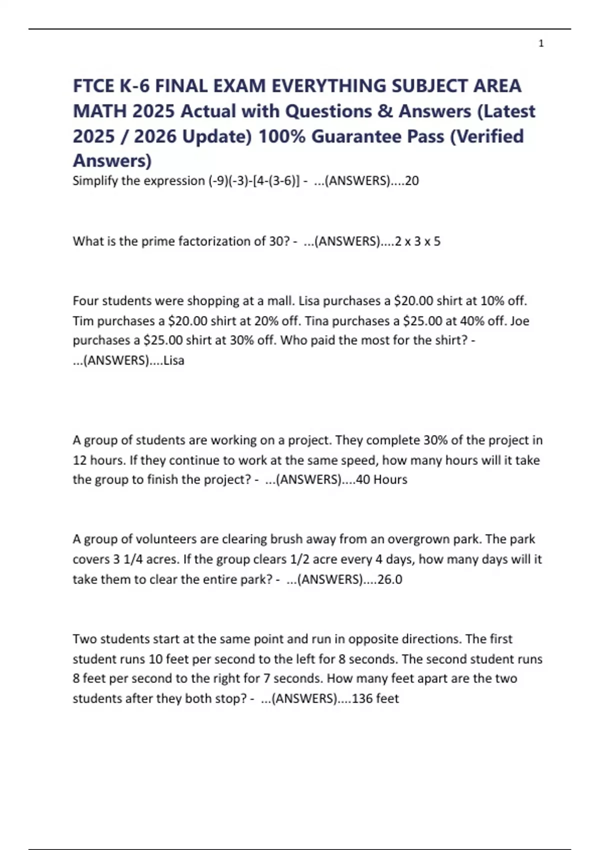 FTCE K-6 FINAL EXAM EVERYTHING SUBJECT AREA MATH 2025 Actual with Questions & Answers (Latest 2025 / 2026 Update) 100% Guarantee Pass (Verified Answers)