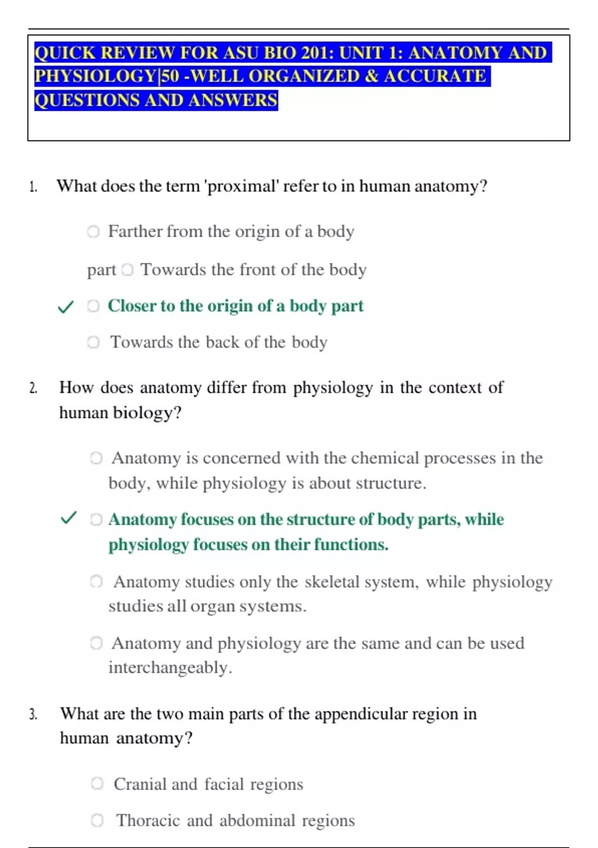 Quick Review for ASU BIO 201: Unit 1 – Anatomy and Physiology | 50 Well-Organized & Accurate Questions and Answers