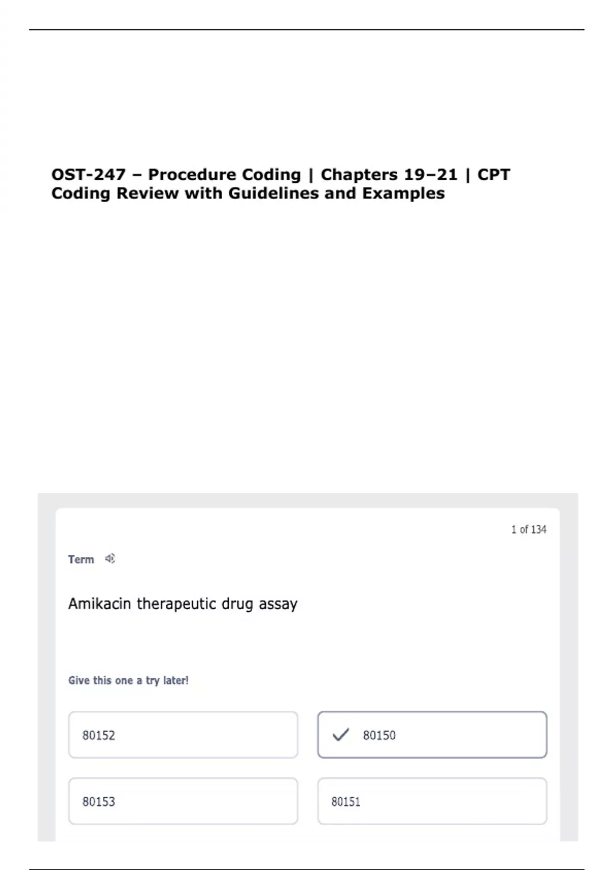 This document provides a detailed summary and practice material for Chapters 19 through 21 of the OST-247 Procedure Coding course. It covers critical topics related to CPT coding, including radiology (Chapter 19), pathology and laboratory services (Chapter 20), and evaluation and management services (Chapter 21). The content includes coding guidelines, common modifiers, documentation tips, and real-world examples to reinforce understanding and exam readiness.