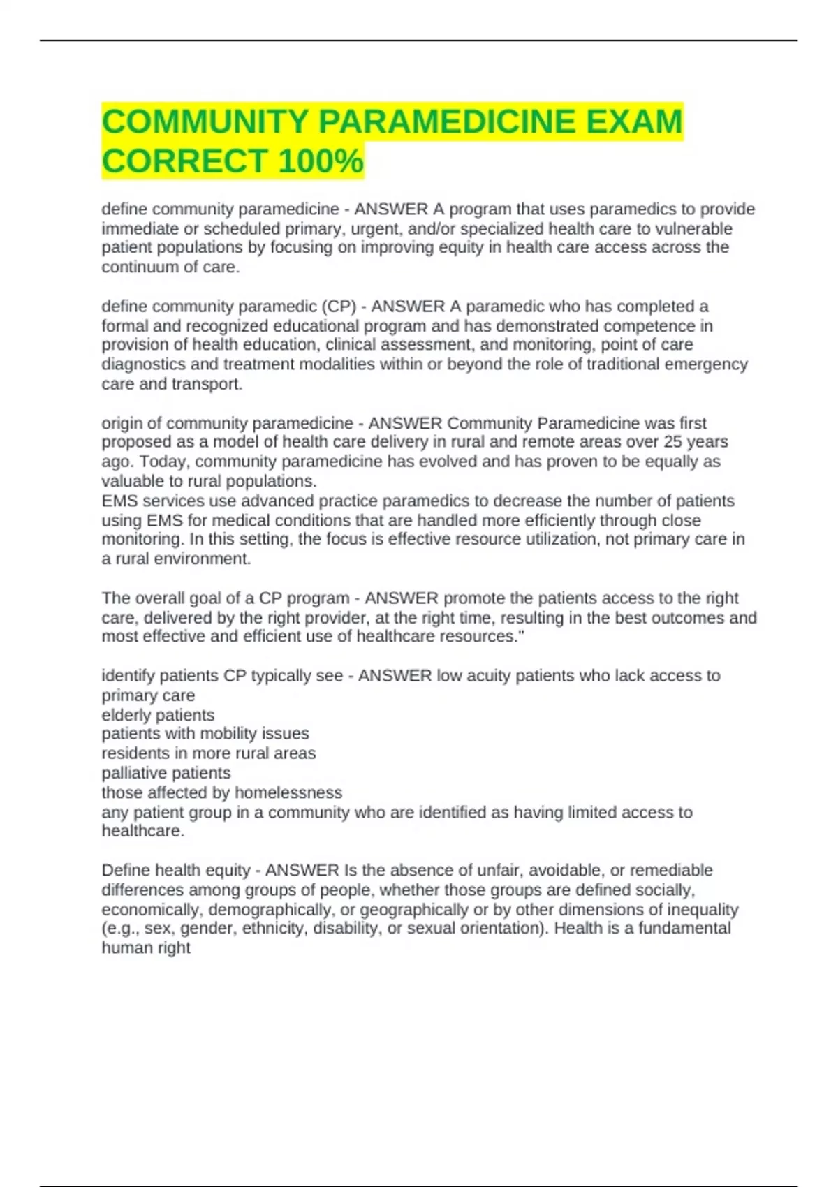 COMMUNITY PARAMEDICINE EXAM CORRECT 100%