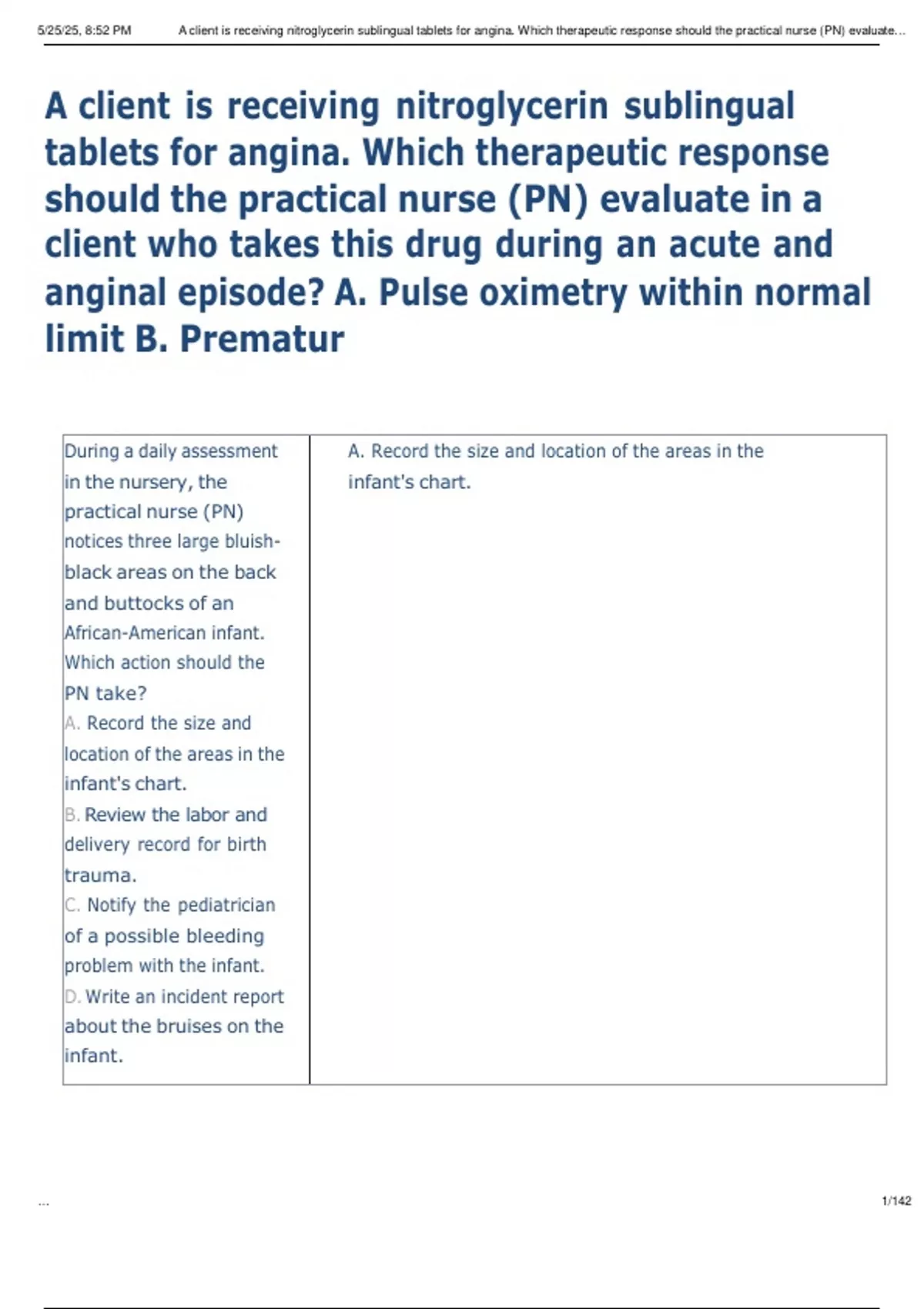 , 5/25/25, 8:52 PM A client is receiving nitroglycerin sublingual tablets for angina. Which therapeutic response should the practical nurse (PN) evaluate…