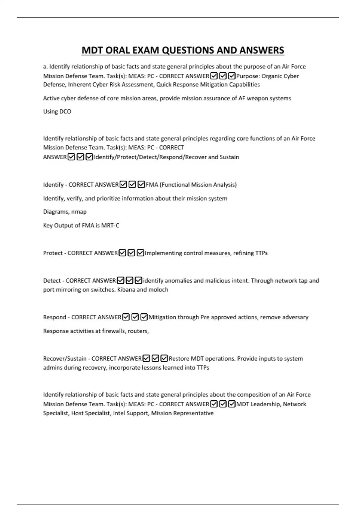 MDT ORAL EXAM QUESTIONS AND ANSWERS a. Identify relationship of basic facts and state general principles about the purpose of an Air Force Mission Defense Team. Task(s): MEAS: PC - CORRECT ANSWERPurpose: Organic Cyber Defense, Inherent Cyber Risk Assessment, Quick Response Mitigation Capabilities Active cyber defense of core mission areas, provide mission assurance of AF weapon systems Using DCO