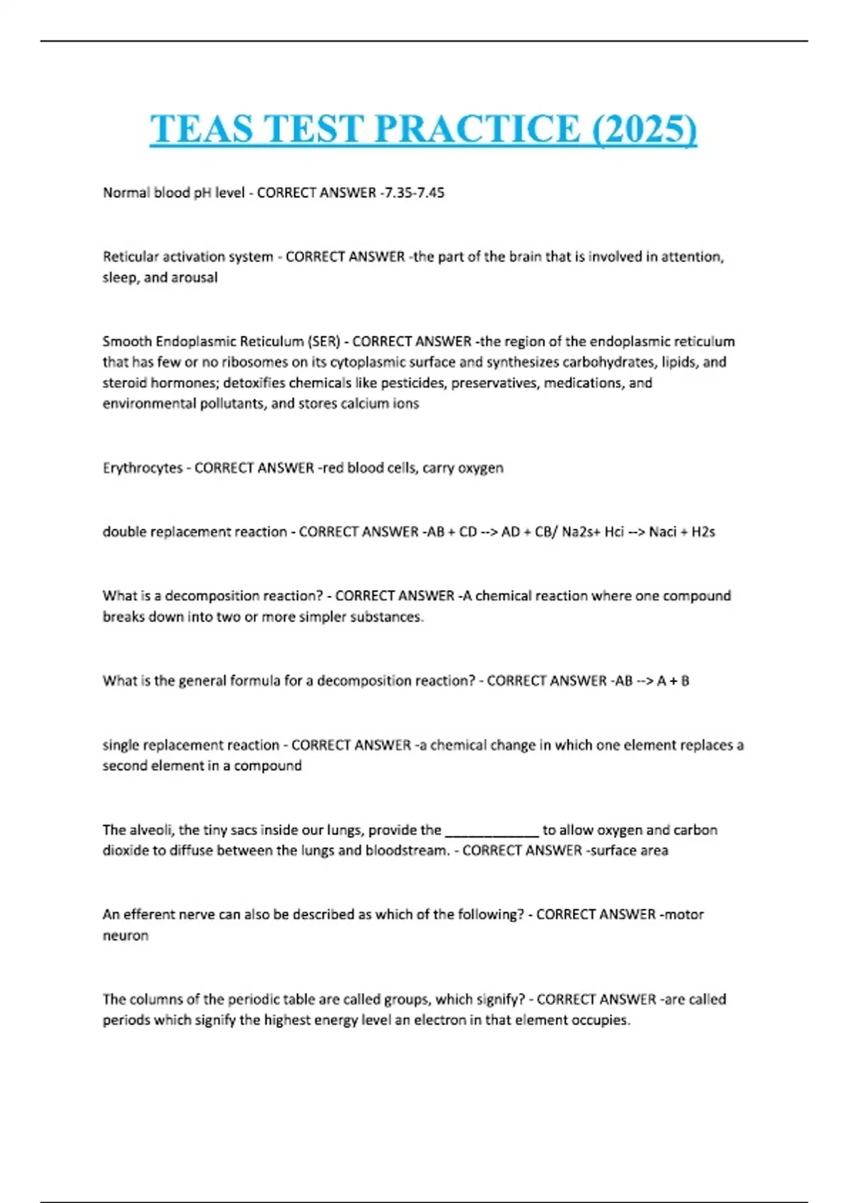 TEAS TEST PRACTICE (2025) Normal blood pH level - CORRECT ANSWER -7.35-7.45 Reticular activation system - CORRECT ANSWER -the part of the brain that is involved in attention, sleep, and arousal Smooth Endoplasmic Reticulum (SER) - CORRECT ANSWER -the region of the endoplasmic reticulum that has few or no ribosomes on its cytoplasmic surface and synthesizes carbohydrates, lipids, and steroid hormones; detoxifies chemicals like pesticides, preservatives, medications, and environmental pollutants, and stores calcium ions Erythrocytes - CORRECT ANSWER -red blood cells, carry oxygen double replacement reaction - CORRECT ANSWER -AB + CD --> AD + CB/ Na2s+ Hci --> Naci + H2s What is a decomposition reaction? - CORRECT ANSWER -A chemical reaction where one compound breaks down into two or more simpler substances. What is the general formula for a decomposition reaction? - CORRECT ANSWER -AB --> A + B single replacement reaction - CORRECT ANSWER -a chemical change in which one element replaces a second element in a compound The alveoli, the tiny sacs inside our lungs, provide the ____________ to allow oxygen and carbon dioxide to diffuse between the lungs and bloodstream. - CORRECT ANSWER -surface area An efferent nerve can also be described as which of the following? - CORRECT ANSWER -motor neuron The columns of the periodic table are called groups, which signify? - CORRECT ANSWER -are called periods which signify the highest energy level an electron in that element occupies.