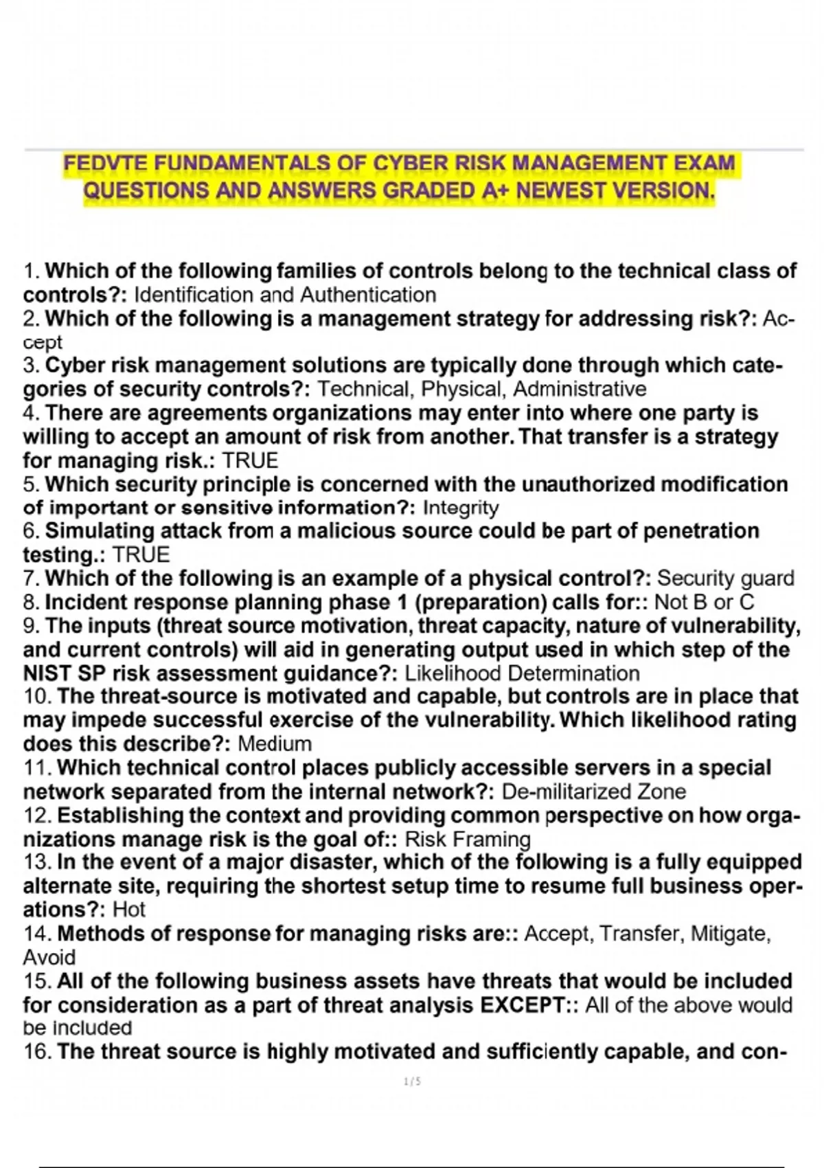FEDVTE FUNDAMENTALS OF CYBER RISK MANAGEMENT EXAM QUESTIONS AND ANSWERS GRADED A+ NEWEST VERSION. cyber risk management exam FEDVTE exam questions cybersecurity fundamentals test risk management questions and answers graded A+ cyber exam latest cyber risk management questions newest cyber exam answers cyber risk management study guide exam prep for cyber management FEDVTE fundamentals test cybersecurity A+ exam cyber risk answers graded A+ updated cyber management exam cyber risk management sample questions exam questions for FEDVTE graded cyber exam answers top cyber risk management exam cyber exam with answers FEDVTE study materials cyber management test prep A+ graded cyber questions current cyber risk management exam cyber risk management fundamentals sample exam questions for cyber risk updated cyber management questions cybersecurity test answers A+ FEDVTE exam guide