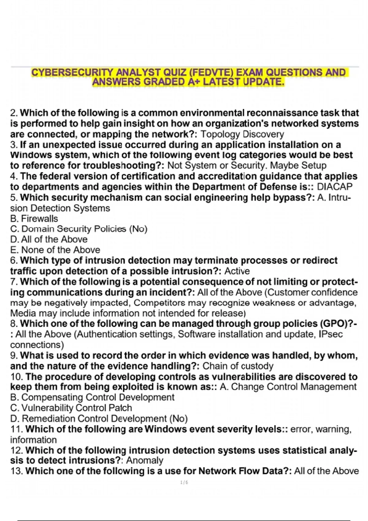 CYBERSECURITY ANALYST QUIZ (FEDVTE) EXAM QUESTIONS AND ANSWERS GRADED A+ LATEST UPDATE. cybersecurity analyst quiz FedVTE exam questions latest FedVTE update cybersecurity exam answers graded cybersecurity questions FedVTE cybersecurity test answers cybersecurity analyst test materials exam preparation cybersecurity analyst A+ graded FedVTE questions latest FedVTE cybersecurity resources FedVTE quiz questions FedVTE cybersecurity answers cybersecurity analyst study guide practice exams for cybersecurity analyst updated FedVTE exam questions FedVTE exam prep exam guide for cybersecurity analyst cybersecurity analyst certification prep FedVTE course questions study materials for FedVTE cybersecurity analyst practice questions quiz materials for cybersecurity exam FedVTE course exam answers cybersecurity certification test questions latest cybersecurity analyst questions how to pass FedVTE exam cybersecurity analyst exam guide answer key for FedVTE exam