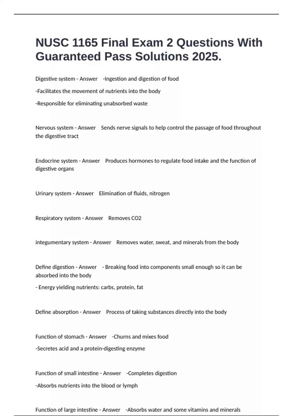 Digestive system - Answer -Ingestion and digestion of food -Facilitates the movement of nutrients into the body -Responsible for eliminating unabsorbed waste Nervous system - Answer Sends nerve signals to help control the passage of food throughout the digestive tract Endocrine system - Answer Produces hormones to regulate food intake and the function of digestive organs Urinary system - Answer Elimination of fluids, nitrogen Respiratory system - Answer Removes CO2 integumentary system - Answer Removes water, sweat, and minerals from the body Define digestion - Answer - Breaking food into components small enough so it can be absorbed into the body - Energy yielding nutrients: carbs, protein, fat Define absorption - Answer Process of taking substances directly into the body Function of stomach - Answer -Churns and mixes food -Secretes acid and a protein-digesting enzyme Function of small intestine - Answer -Completes digestion -Absorbs nutrients into the blood or lymph Function of large intestine - Answer -Absorbs water and some vitamins and minerals -Home to intestinal bacteria -Passes waste material