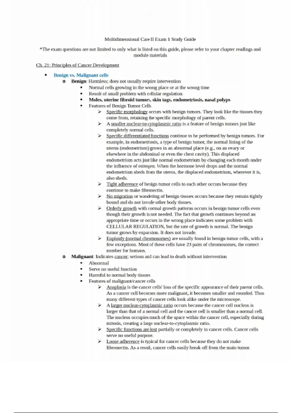 Multidimensional Care II Exam 1 Study Guide *The exam questions are not limited to only what is listed on this guide, please refer to your chapter readings and module materials Ch. 21: Principles of Cancer Development Benign vs. Malignant cells o Benign: Harmless; does not usually require intervention Normal cells growing in the wrong place or at the wrong time Result of small problem with cellular regulation Moles, uterine fibroid tumors, skin tags, endometriosis, nasal polyps Features of Benign Tumor Cells Specific morphology occurs with benign tumors. They look like the tissues they come from, retaining the specific morphology of parent cells. A smaller nuclear-to-cytoplasmic ratio is a feature of benign tumors just like completely normal cells. Specific differentiated functions continue to be performed by benign tumors. For example, in endometriosis, a type of benign tumor, the normal lining of the uterus (endometrium) grows in an abnormal place (e.g., on an ovary or elsewhere in the abdominal or even the chest cavity). This displaced endometrium acts just like normal endometrium by changing each month under the influence of estrogen. When the hormone level drops and the normal endometrium sheds from the uterus, the displaced endometrium, wherever it is, also sheds. Tight adherence of benign tumor cells to each other occurs because they continue to make fibronectin. No migration or wandering of benign tissues occurs because they remain tightly bound and do not invade other body tissues. Orderly growth with normal growth patterns occurs in benign tumor cells even though their growth is not needed. The fact that growth continues beyond an appropriate time or occurs in the wrong place indicates some problem with CELLULAR REGULATION, but the rate of growth is normal. The benign tumor grows by expansion. It does not invade. Euploidy (normal chromosomes) are usually found in benign tumor cells, with a few exceptions. Most of these cells have 23 pairs of chromosomes, the correct number for humans. o Malignant: Indicates cancer; serious and can lead to death without intervention Abnormal Serve no useful function Harmful to normal body tissues Features of malignant/cancer cells Anaplasia is the cancer cells' loss of the specific appearance of their parent cells. As a cancer cell becomes more malignant, it becomes smaller and rounded. Thus many different types of cancer cells look alike under the microscope. A larger nuclear-cytoplasmic ratio occurs because the cancer cell nucleus is larger than that of a normal cell and the cancer cell is smaller than a normal cell. The nucleus occupies much of the space within the cancer cell, especially during mitosis, creating a large nuclear-to-cytoplasmic ratio. Specific functions are lost partially or completely in cancer cells. Cancer cells serve no useful purpose. Loose adherence is typical for cancer cells because they do not make fibronectin. As a result, cancer cells easily break off from the main tumor. Migration occurs because cancer cells do not bind tightly together and have many enzymes on their cell surfaces. These features allow the cells to slip through blood vessel walls and between tissues, spreading from the main tumor site to many other body sites. The ability to spread (metastasize) is unique to cancer cells and is a major cause of death. Cancer cells invade other tissues, both close by and more remote from the original tumor. Invasion and persistent growth make untreated cancer deadly. Contact inhibition does not occur in cancer cells because of lost CELLULAR REGULATION, even when all sides of these cells are in continuous contact with the surfaces of other cells. This persistence of cell division makes the disease difficult to manage. Rapid or continuous cell division occurs in many types of cancer cells because they do not respond to check-point control of cell division because of gene changes that reduce the effectiveness of CELLULAR REGULATION and reenter the cell cycle for mitosis almost continuously. In addition, these cells also do not respond to signals for apoptosis. Most cancer cells have a lot of the enzyme telomerase, which maintains telomeric DNA. As a result, cancer cells do not respond to apoptotic signals and have an unlimited life span (are “immortal”). Abnormal chromosomes in which the chromosome number and/or structure is not normal (aneuploidy) are common in cancer cells as they become more malignant. Chromosomes are lost, gained, or broken; thus cancer cells can have more than 23 pairs or fewer than 23 pairs. Cancer cells also may have broken and rearranged chromosomes with mutated genes. Seven warning signs of cancer o C- Changes in bowl and bladder habits o A- A sore that does not heal o U- Unusual bleeding or discharge o T- Thickening or lump in the breast or elsewhere o I- Indigestion or difficulty swallowing o O- Obvious change in a wart or mole o N- Nagging cough or hoarseness Cancer development stages of malignancy Cancer classification o Classification of Tumors by Tissue of Origin Prefix: Adeno; tissue of origin: epithelial glands; benign: adenoma; malignant: adenocarcinoma Prefix: chondro; tissue of origin: cartilage; benign: chondroma; malignant: chondrosarcoma Prefix: fibro; tissue of origin: fibrous cartilage; benign: fibroma; malignant: fibrosarcoma Prefix: glio; tissue of origin: glial cells (brain); benign: glioma; malignant: glioblastoma Prefix: Hemangio; tissue of origin: Blood vessel; benign: Hemangioma; malignant: Hemangiosarcoma Prefix:Hepato; tissue of origin: Liver; benign: Hepatoma; malignant: Hepatocarcinoma/Hepatoblastoma Prefix: Leiomyo; tissue of origin: Smooth muscle; benign: Leiomyoma; malignant: Leiomyosarcoma Prefix: Lipo; tissue of origin: Fat/adipose; benign: Lipoma; malignant: Liposarcoma Prefix: Lympho; tissue of origin: Lymphoid tissues; no benign; malignant: Malignant lymphomas/Hodgkin's lymphoma/Non-Hodgkin's lymphoma/Burkitt's lymphoma/Cutaneous T-cell Prefix: Melano; ti
