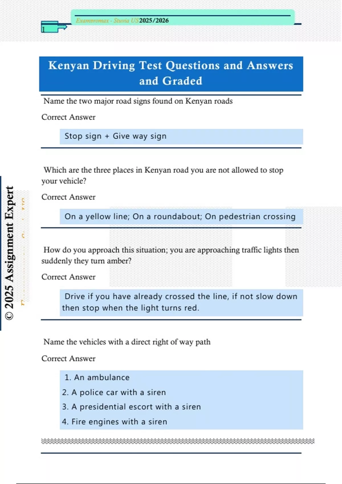 Kenyan Driving Test Questions and Answers and Graded