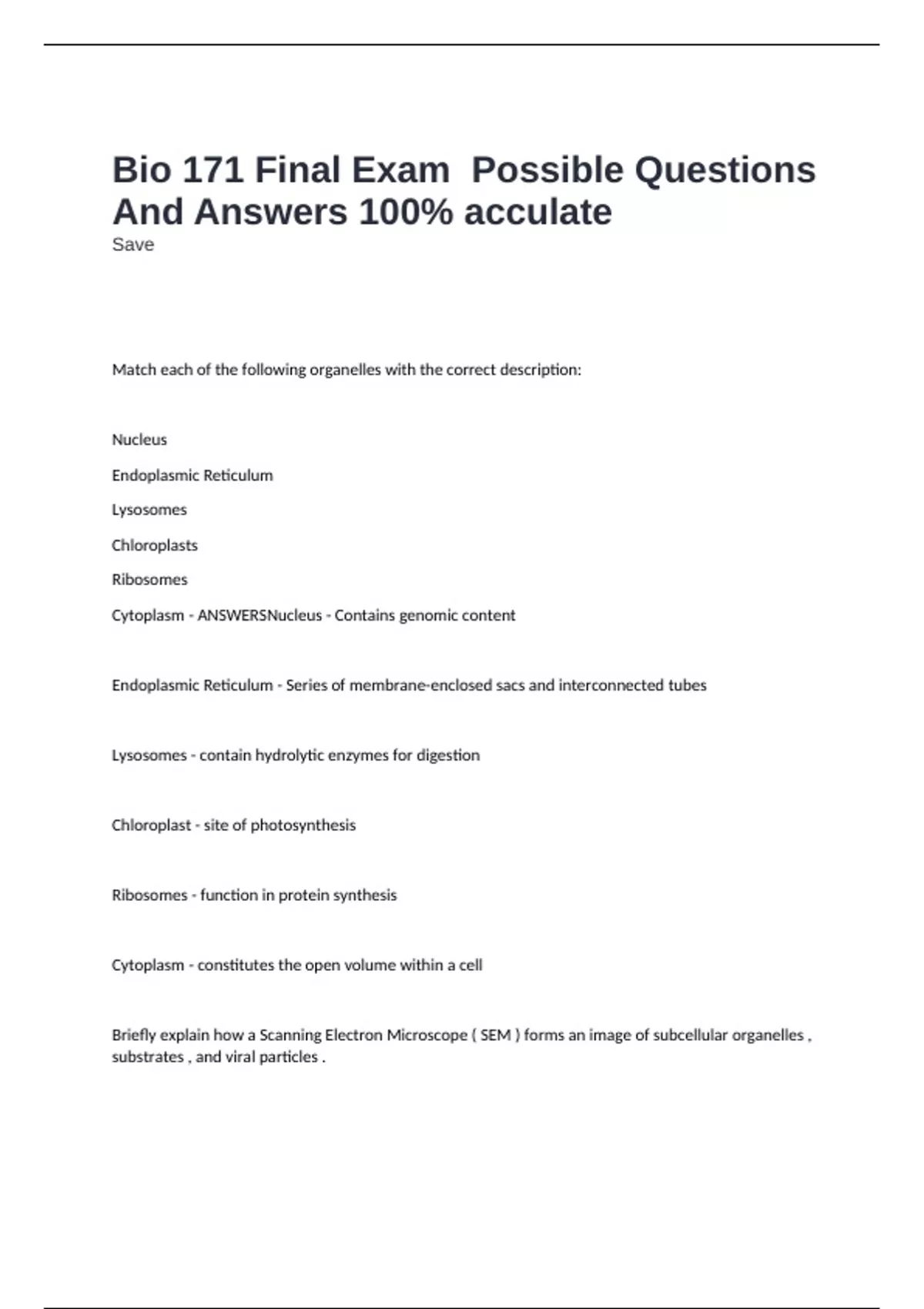 Bio 171 Final Exam Possible Questions And Answers 100% acculate Save