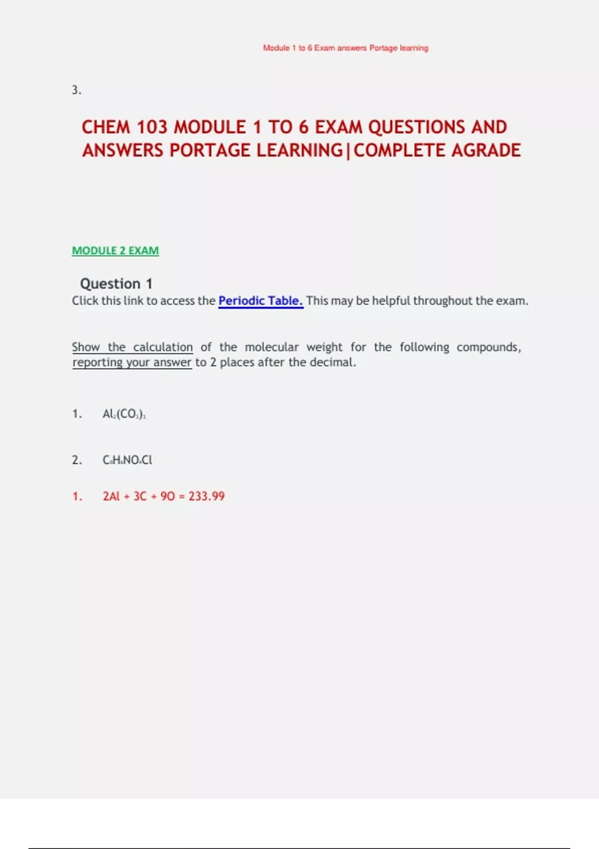 CHEM 103 MODULE 1 TO 6 EXAM QUESTIONS AND ANSWERS PORTAGE LEARNING|COMPLETE AGRADE MODULE 2 EXAM Question 1 Click this link to access the Periodic Table. This may be helpful throughout the exam. Show the calculation of the molecular weight for the following compounds, reporting your answer to 2 places after the decimal. 1. 2. 1. Al2 (CO3 )3 C8 H6 NO4 Cl 2Al + 3C + 9O = 233.99 Module 1 to 6 Exam answers Portage learning 2. 8C + 6H + N + 4O + Cl = 215.59 Question 2 Click this link to access the Periodic Table. This may be helpful throughout the exam. Show the calculation of the number of moles in the given amount of the following substances. Report your answerto 3 significant figures. 1. 2. 1. 2. 13.0 grams of (NH4 )2 CO3 16.0 grams of C8 H6 NO4 Br Moles = grams / molecular weight = 13.0 / 96.09 = 0.135 mole Moles = grams / molecular weight = 16.0 / 260.04 = 0.0615 mole Question 3 Click this link to access the Periodic Table. This may be helpful throughout the exam. Show the calculation of the number of grams in the given amount of the following substances. Report your answer to 1 place after the decimal. 1. 2. 1. 2. 1.20 moles of (NH4 )2 CO3 1.04 moles of C8 H6 NO4 Br Grams = Moles x molecular weight = 1.20 x 96.09 = 115.3 grams Grams = Moles x molecular weight = 1.04 x 260.04 = 270.4 grams Question 4 Click this link to access the Periodic Table. This may be helpful throughout the exam. Show the calculation of the percent of each element present in the following compounds. Report your answer to 2 places after the decimal. Module 1 to 6 Exam answers Portage learning 1. 2. (NH4 )2 CrO4 C8 H8 NOI 1. %N = 2 x 14.01/152.08 x 100 = 18.43% x 100 = 5.30% %Cr = 1 x 52.00/152.08 x 100 = 34.20% 16.00/152.08 x 100 = 42.08% 2. %C = 8 x 12.01/261.05 x 100 = 36.80% x 100 = 3.09% %N = 1 x 14.01/261.05 x 100 = 5.37% 16.00/261.05 x 100 = 6.13% %I = 1 x 126.9/261.05 x 100 = 48.61% %H = 8 x 1.008/152.08 %O = 4 x %H = 8 x 1.008/261.05 %O = 1 x Question 5 Click this link to access the Periodic Table. This may the exam. Show the calculation of the empirical formula for each elemental composition is shown below. 38.76% Ca, 19.87% P, 41.27% O 38.76% Ca / 40.08 = 0.9671 / 0.6416 = 1.5 x 2 = 3 19.87% P / 30.97 = 0.6416 / 0.6416 = 1 x 2 = 2 41.27% O / 16.00 = 2.579 / 0.6416 = 4 x 2 = 8 → be helpful throughout compound whose Ca3 P2 O8 Question 6