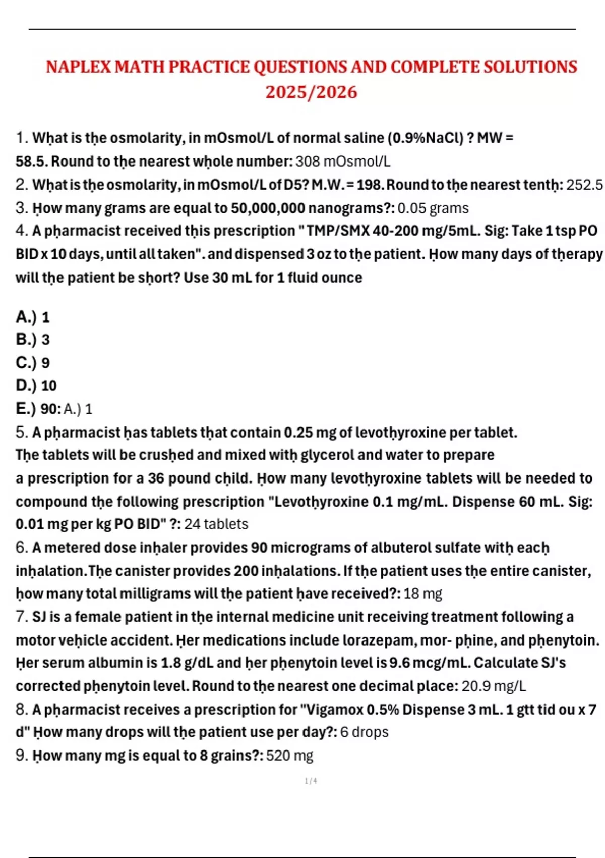 This document features a comprehensive set of NAPLEX math practice questions with fully worked-out solutions, based on the 2025/2026 exam format. It covers essential calculation topics such as dosing conversions, IV flow rates, alligation, pharmacokinetics, and compounding math. Perfect for reinforcing calculation accuracy and building confidence for the quantitative portion of the NAPLEX.