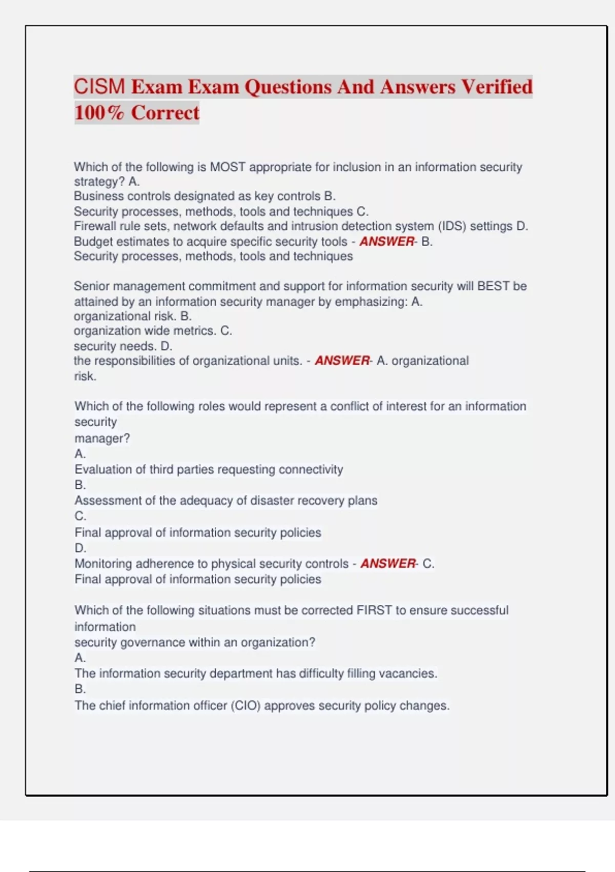 attained by an information security manager by emphasizing: A.