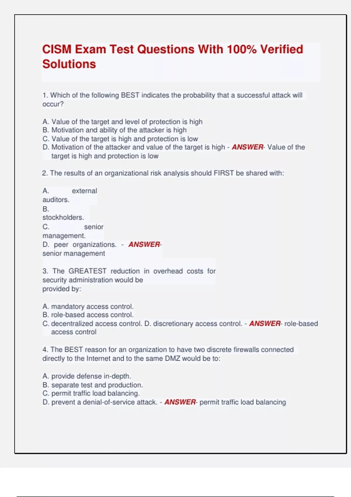 CISM Exam Test Questions With 100% Verified Solutions 1. Which of the following BEST indicates the probability that a successful attack will occur? A. Value of the target and level of protection is high B. Motivation and ability of the attacker is high C. Value of the target is high and protection is low D. Motivation of the attacker and value of the target is high - ANSWER- Value of the target is high and protection is low 2. The results of an organizational risk analysis should FIRST be shared with: A. external auditors. B. stockholders. C. senior management. D. peer organizations. - ANSWER- senior management 3. The GREATEST reduction in overhead costs for security administration would be provided by: A. mandatory access control. B. role-based access control. C. decentralized access control. D. discretionary access control. - ANSWER- role-based access control 4. The BEST reason for an organization to have two discrete firewalls connected directly to the Internet and to the same DMZ would be to: A. provide defense in-depth. B. separate test and production. C. permit traffic load balancing. D. prevent a denial-of-service attack. - ANSWER- permit traffic load balancing 5. Accountability by business process owners can BEST be obtained through: A. periodic reminder memorandums. B. strict enforcement of policies. C. policies signed by IT management. D. education and awareness meetings. - ANSWER- education and awareness meetings 26. Which of the following is the BEST method for ensuring that security procedures and guidelines are read and understood? A. Periodic focus group meetings B. Periodic reminder memos to management C. Computer-based training (CBT) presentations D. Employees signing an acknowledgement of receipt - ANSWER- Computer-based training (CBT) presentations 8. Which of the following is the MOST effective solution for preventing internal users from modifying sensitive and classified information? A. Baseline security standards B. System access logs C. Role-based access controls D. Intrusion detection system - ANSWER- Role-based access controls 9. Which of the following devices should be placed within a DMZ? A. Network switch B. Web server C. Database server D. File/print server - ANSWER- Web server 10. Access to a sensitive intranet application by mobile users can BEST be accomplished through: A. data encryption. B. digital signatures. C. strong passwords. D. two-factor authentication. - ANSWER- two-factor authentication 11. An information security program should be sponsored by: A. infrastructure management. B. the corporate legal department. C. key business process owners. D. quality assurance management. - ANSWER- key business process owners 12. The BEST way to ensure that security settings on each platform are in compliance with information security policies and procedures is to: A. perform penetration testing. B. establish security baselines. C. implement vendor default settings. D. link policies to an independent standard. - ANSWER- establish security baselines 13. Which of the following will MOST likely reduce the likelihood of an unauthorized individual gaining access to computing resources by pretending to be an authorized individual needing to have their password reset? A. Performing reviews of password resets. B. Conducting security awareness programs. C. Increasing the frequency of password changes. D. Implementing automatic password syntax checking. - ANSWER- Conducting security awareness programs 14. Which of the following is the BEST indicator that security awareness training has been effective? A. Have employees sign to confirm they have read the security policy. B. More incidents are being reported. C. A majority of employees have received training. D. Feedback forms from training are favorable. - ANSWER- More incidents are being reported 15. Which of the following metrics would be the MOST useful in measuring how well information security is monitoring violation logs? The number of: A. penetration attempts investigated. B. violation log reports reviewed. C. violation log entries reviewed. D. hours charged to the review process. - ANSWER- penetration attempts investigated
