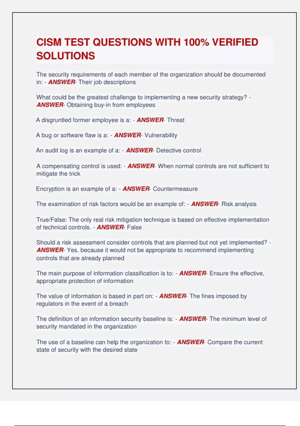 CISM TEST QUESTIONS WITH 100% VERIFIED SOLUTIONS The security requirements of each member of the organization should be documented in: - ANSWER- Their job descriptions What could be the greatest challenge to implementing a new security strategy? - ANSWER- Obtaining buy-in from employees A disgruntled former employee is a: - ANSWER- Threat A bug or software flaw is a: - ANSWER- Vulnerability An audit log is an example of a: - ANSWER- Detective control A compensating control is used: - ANSWER- When normal controls are not sufficient to mitigate the trick Encryption is an example of a: - ANSWER- Countermeasure The examination of risk factors would be an example of: - ANSWER- Risk analysis True/False: The only real risk mitigation technique is based on effective implementation of technical controls. - ANSWER- False Should a risk assessment consider controls that are planned but not yet implemented? - ANSWER- Yes, because it would not be appropriate to recommend implementing controls that are already planned The main purpose of information classification is to: - ANSWER- Ensure the effective, appropriate protection of information The value of information is based in part on: - ANSWER- The fines imposed by regulators in the event of a breach The definition of an information security baseline is: - ANSWER- The minimum level of security mandated in the organization The use of a baseline can help the organization to: - ANSWER- Compare the current state of security with the desired state The purpose of a Business Impact Analysis (BIA) is to: - ANSWER- Estimate the potential impact on the business in case of a system failure The ultimate goal of BIA is to: - ANSWER- determine the priorities for recovery of business processes and systems New controls should be implemented as a part of the risk mitigation strategy: - ANSWER- In areas where the cost of the control is justified by the benefit obtained An example of risk transference as a risk mitigation option is: - ANSWER- The purchase of insurance to cover some of the losses associated with an incident. The purpose of a life cycle (as used in the Systems Development Life Cycle (SDLC)) is to: - ANSWER- Assist in the management of a complex project by breaking it into individual steps At which stage of a project should risk management be performed? - ANSWER- At each stage starting at project initiation When working with an outside party that may include access to sensitive information, each party should require a: - ANSWER- Non-disclosure agreement (NDA) Symmetric key algorithms are best used for: - ANSWER- Encryption of large amounts of data An benefit provided by a symmetric algorithm is: - ANSWER- confidentiality Asymmetric algorithms are often used in: - ANSWER- Digital signatures The primary benefit of a hash function is: - ANSWER- Proving integrity of a message Which key would open a message encrypted with John's public key? - ANSWER- John corresponding private key Symmetric encryption is a: - ANSWER- two-way encryption process A primary reason for the development of public key cryptography was to: - ANSWER- Address the ley distribution problems of asymmetric encryption What is the length of a digest created by a hash function? - ANSWER- A hash function creates a fixed length hash regardless of input message length A hash is often used for: - ANSWER- Password based authentication The entity requesting access in an access control system is often known as: - ANSWER- The subject Access control is a means to: - ANSWER- Permit authorized persons appropriate levels of access A surveillance camera is an access control based on: - ANSWER- Physical controls Anti-virus systems should be deployed on: - ANSWER- Gateways and individual desktops The use of a policy compliant system may enable an organization to: - ANSWER- Enforce policies at a desktop level An information classification policy is what form of control? - ANSWER- Administrative controls Which of the following is a one-way function? - ANSWER- Hashing True/False: A Disaster Recovery Plan is a part of an Information Security Framework - ANSWER- True An important element of an information security program is: - ANSWER- The development of metrics to measure program performance Identity management applies to: - ANSWER- Giving both internal and external users unique identification The practice of only granting a user the lowest level required is: - ANSWER- Least privilege A deterrent control can be used to: - ANSWER- Discourage inappropriate behavior An example of a preventative control is: - ANSWER- A fence A disadvantage of an automated control may be: - ANSWER- That it may implement a configuration change automatically without review The implementation of a security program requires: - ANSWER- a person that takes ownership of each activity