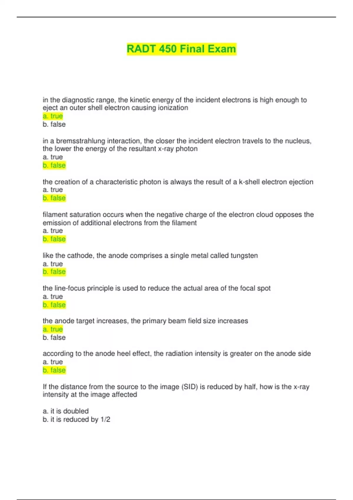 RADT 450 Final Exam | Updated Spring 2025, Complete Solutions in the diagnostic range, the kinetic energy of the incident electrons is high enough to eject an outer shell electron causing ionization a. true b. false in a bremsstrahlung interaction, the closer the incident electron travels to the nucleus, the lower the energy of the resultant x-ray photon a. true b. false the creation of a characteristic photon is always the result of a k-shell electron ejection a. true b. false filament saturation occurs when the negative charge of the electron cloud opposes the emission of additional electrons from the filament a. true b. false like the cathode, the anode comprises a single metal called tungsten a. true b. false the line-focus principle is used to reduce the actual area of the focal spot a. true b. false the anode target increases, the primary beam field size increases a. true b. false according to the anode heel effect, the radiation intensity is greater on the anode side a. true b. false If the distance from the source to the image (SID) is reduced by half, how is the x-ray intensity at the image affected a. it is doubled b. it is reduced by 1/2 c. it is increased 4 times d. it is reduced by 1/4 if a technologist changes the technique from 70 kVp @ 200 mAs to 70 kVp @ 400 mAs, the x-ray intensity will ---- and optical density will ---- a. remain the same; remain the same b. remain the same; double c. double; remain the same d. double; double the inverse square law has the same effect on optical density and x-ray a. quantity b. intensity c. exposure d. all of the above An increase of 15% in kVp is equivalent to increasing mAs ---- a. 50% b. 100% c. 30% d. 15% if an exposure is 50mR at an SID of 40 inches, what would the exposure be at an SID of 60 inches a. 75mR b. 112.5mR c. 33.3mR d. 22.2mR (50(40^2))/60^2 beam quality is affected by a. mAs and distance b. filtration and mAs c. kVp and mAs d. kVp and filtration the half value layer (HVL) of an x-ray beam is a measurement of beam ---- a. intensity b. quantity c. quality d. all of the above The energy of a bremsstrahlung photon is a. the difference between the entering and exiting kinetic energy of the electron b. equal to the kinetic energy of the exiting electron c. the sum of the entering and exiting kinetic energy of the electron d. equal to the kinetic energy of the entering electron Bremsstrahlung interactions may occur only when the incident electron interacts with a. an inner shell electron b. an outer shell electron c. the force field of the nucleus d. none of the above At the end of the characteristic cascade, the ____ shell is missing an electron a. innermost b. outermost c. characteristic d. k the k-shell can hole a maximum of ---- electrons a. 6 b. 2 c. 1 d. 8 Most of the heat generated at the target is due to _____. a. nucleus bombardment d. inner shell ionization c. k x-rays d. outer shell excitation the production of heat at the anode is directly proportional to a. kVp b. filament current c, rotor speed d. tube current The useful characteristic x-rays from tungsten targets are ---- x-rays. a. N-shell b. L-shell c. K-shell d. M-shell At 55 kVp, _____ of the x-rays produced are bremsstrahlung. a. 100% b. 15% c. 80% d. none characteristic x-rays are produced by a. excitation of outer shell electron b. nuclear fragmentation c. braking electrons d. released binding energy An exposure taken at 100 kVp would have a continuous emission spectrum with a maximum energy of _____ keV. a. 69 b. 140 c. 100 d. 30 An increase in kVp would _____ the _____ of the emission spectrum. a. not affect; amplitude and position b. increase; amplitude only c. increase; position only d. increase; amplitude and position How does added filtration affect the emission spectrum? a. reduced amplitude and a shift to the right b. increased amplitude and a shift to the left c. increased amplitude and a shift to the right d. reduced amplitude and a shift to the left As an x-ray tube ages, the inside can become coated with tungsten, which can cause _____ in the tube. a. off-focus radiation b. anode pitting c. arcing d. convection thermionic emission at the filament creates a a. grid control b. heel effect c. line focus d. space charge the rotating anode is turned by a a. thermal cushion b. mechanical pulley c. rotating belt d. magnetic field Because of the line focus principal, the effective focal spot size decreases with decreasing _____. a. target angle b. window thickness c. rotor speed d. space charge The cathode side of the tube should be directed toward the ______ part of the patient. a. thicker b. upper c. lower d. thinner tube failure can occur from a. high kVp techniques b. long exposure times c. short exposure times d. extrafocal radiation The filament in an x-ray tube is about ______ in length a. 10-20 cm b. 8-10 cm c. 1-2 cm d. 3-4 cm the ---- is/are outside the glass envelope a. rotor b. focal spot c. stators d. filaments Extrafocal or off-focus radiation is produced from _____. a. scattered x-rays b. rebounding electrons c. dual focus cathodes d. overheated anodes each of the following is a material of choice for the filament except a. molybdenum b. tungsten c. rhenium d. copper the most common diagnostic radiography target angle is ---- degrees a. 45 b. 54 c. 24 d. 12 the operating console contains circuits that are a. high voltage only b. low voltage only c. non voltage d. both high and low voltage Variations in power distribution to the x-ray machine are corrected by the _____. a. high voltage autotransformer b. automatic exposure control c. line voltage compensator d. full-wave rectifier the first component to receive power in the x-ray circuit is the a. autotransformer b. rectifier c. high voltage transformer d. mA meter a step-down transformer is located in the ---- circuit a. timing b. rectifier c. tube d. filament the automatic exposure control (AEC) terminates the exposure when a. the set time is reached b. sufficient radiation reaches t