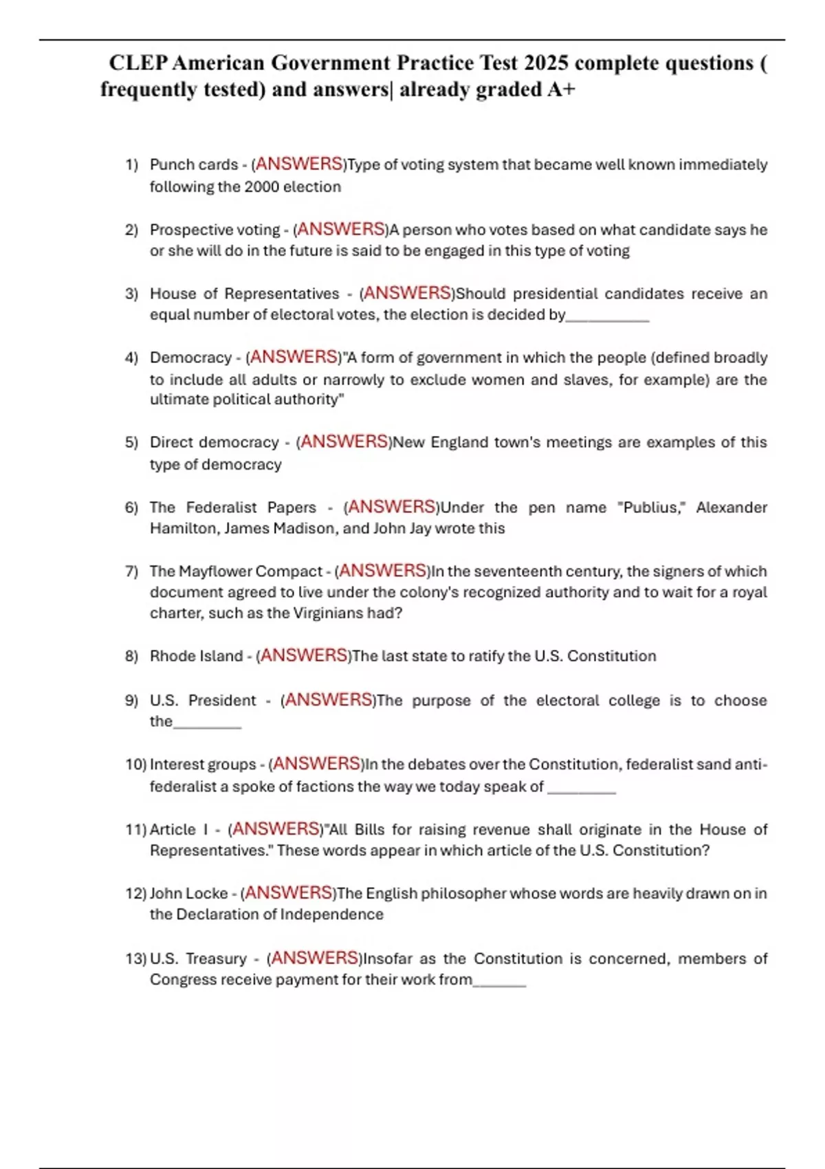 CLEP American Government Practice Test 2025 complete questions ( frequently tested) and answers| already graded A+ Save