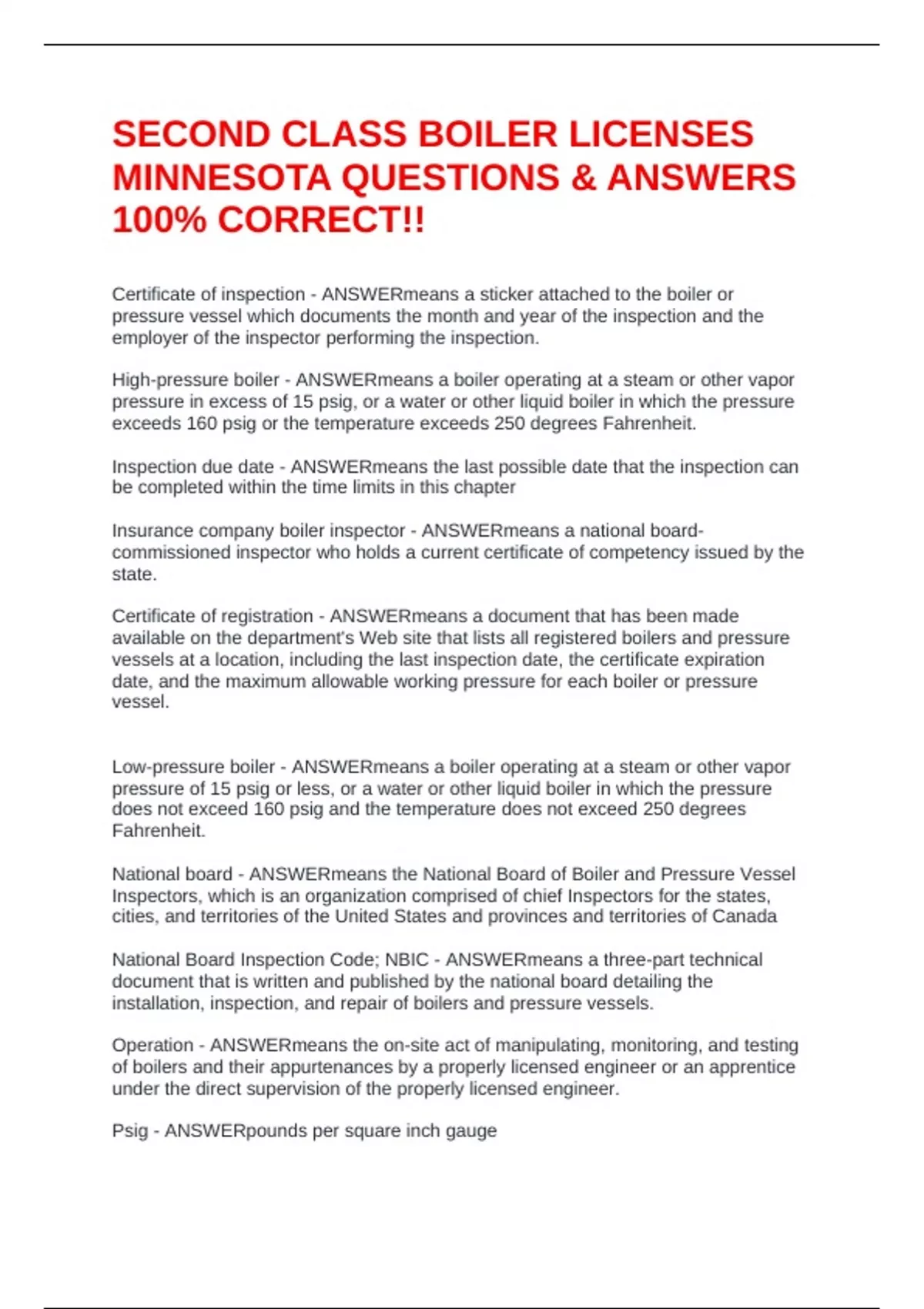 SECOND CLASS BOILER LICENSES MINNESOTA QUESTIONS & ANSWERS 100% CORRECT!!