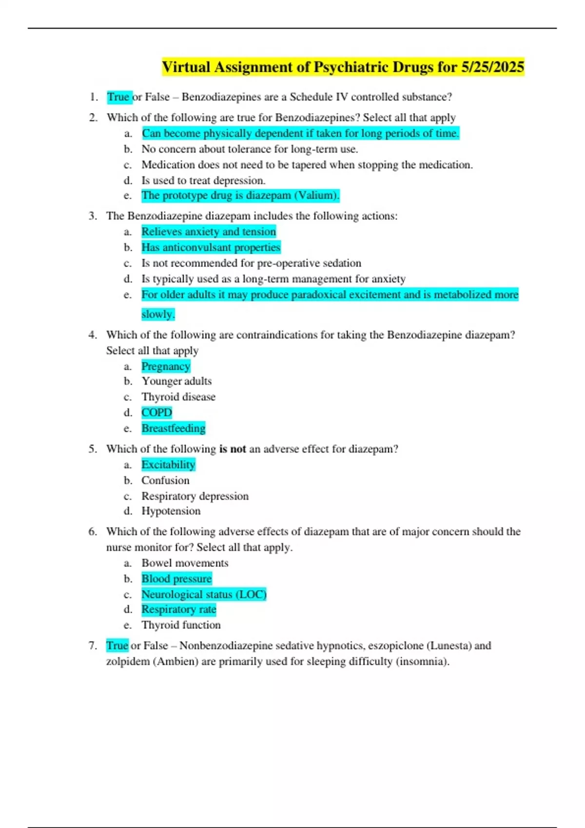 Virtual Assignment of Psychiatric Drugs for 5/25/2025 1. True or False – Benzodiazepines are a Schedule IV controlled substance? 2. Which of the following are true for Benzodiazepines? Select all that apply a. Can become physically dependent if taken for long periods of time. b. No concern about tolerance for long-term use. c. Medication does not need to be tapered when stopping the medication. d. Is used to treat depression. e. The prototype drug is diazepam (Valium). 3. The Benzodiazepine diazepam includes the following actions: a. Relieves anxiety and tension b. Has anticonvulsant properties c. Is not recommended for pre-operative sedation d. Is typically used as a long-term management for anxiety e. For older adults it may produce paradoxical excitement and is metabolized more slowly. 4. Which of the following are contraindications for taking the Benzodiazepine diazepam? Select all that apply a. Pregnancy b. Younger adults c. Thyroid disease d. COPD e. Breastfeeding 5. Which of the following is not an adverse effect for diazepam? a. Excitability b. Confusion c. Respiratory depression d. Hypotension 6. Which of the following adverse effects of diazepam that are of major concern should the nurse monitor for? Select all that apply. a. Bowel movements b. Blood pressure c. Neurological status (LOC) d. Respiratory rate e. Thyroid function 7. True or False – Nonbenzodiazepine sedative hypnotics, eszopiclone (Lunesta) and zolpidem (Ambien) are primarily used for sleeping difficulty (insomnia). 8. Which of the following are CNS depressant effects of the Nonbenzodiazepine sedative hypnotic eszopiclone (Lunesta)? Select all that apply. a. Increased memory b. Sleep walking c. Increased alertness d. Sleep driving and eating e. Impaired motor coordination 9. Which of the following considerations is important to include in a teaching plan for a patient on the Nonbenzodiazepine sedative hypnotic zolpidem (Ambien)? a. This medication is recommended for long-term use. b. It is okay to drink alcohol and take other CNS depressant medications and herbal supplements with this. c. Should be taken at bedtime d. May operate heavy equipment after taking 10. Which of the following is not considered an antidepressant? a. SSRI’s b. Adrenergic blockers c. MAO Inhibitors d. Tricyclic antidepressants 11. Which of the following should be included in patient teaching about antidepressants? a. It is okay to take an antidepressant with St. John’s Wort b. Do not stop taking medication when symptoms subside c. Do not take over-the-counter (OTC) medications without consulting your HCP. d. Taking antidepressants while pregnant is not a concern. e. Therapeutic effects may take up to 2-4 weeks to occur. 12. True or False – Tricyclic antidepressants are the oldest drugs used for depression of which many are second-line treatments now. 13. Which of the following is not a Tricyclic antidepressant? a. Imipramine b. Amitriptyline c. Fluoxetine (Prozac) d. Nortriptyline 14. The action of the tricyclic antidepressant Imipramine is (Select all that apply): a. Blocks the reuptake of norepinephrine b. Blocks the reuptake of serotonin c. Is an acetylcholine agonist d. Treats major depression e. Facilitates the reabsorption of serotonin 15. Which of the following are adverse effects of the tricyclic antidepressant drug Imipramine? Select all that apply a. Excitability b. Cardiac dysrhythmias c. Hypertension d. Weight loss e. Serotonin syndrome 16. Which of the following should be included as nursing implications / patient teaching plan of the tricyclic antidepressant drug Imipramine? a. Improvement of depression S/S my take up to 4-8 weeks to see a response. b. It is okay to drink alcohol while taking this drug. c. It is best to take the medication in the morning. d. There are no food restrictions with this drug. 17. True or False – Selective Serotonin Reuptake Inhibitors (SSRIs) primarily affect serotonin and not other neurotransmitters. 18. True or False - SSRIs are used for the treatment of major depressive disorder as well as other mood and mental health disorders. 19. The SSRI Fluoxetine (Prozac) has which of the following actions? a. Cannot be used for certain anxiety disorders. b. Blocks the reabsorption of serotonin for as its antidepressant effect c. Is not used for bulimia nervosa d. Is not used in the management of major depressive disorders. 20. You are preparing a teaching plan for a patient on the SSRI Fluoxetine (Prozac). Which of the following should be included the teaching plan? Select all that apply a. Is a CNS stimulant b. Can cause hypotensive crisis when combined with other drugs. c. Discontinuation of the drug abruptly can cause dysphoria and mood changes. d. Does not have a risk for bleeding e. Can cause sexual dysfunctions. f. It may take 8-12 weeks for therapeutic effects. 21. True or False – Serotonin-Norepinephrine Reuptake Inhibitors (SNRIs) only inhibits the uptake of serotonin. 22. The Serotonin-Norepinephrine Reuptake Inhibitors (SNRIs) drug Venlafaxine has which of the following actions? Select all that apply a. Anxiety, dizziness, insomnia, nervousness, tremors b. Anorexia and weight loss c. Is okay to take when pregnant d. Sweating, rash, and itching e. Is only used for anxiety disorders 23. True or False – Monoamine Oxidase (MAO) Inhibitors are a first-line agent for the treatment of depression. 24. Monoamine Oxidase (MAO) Inhibitors adverse effects are which of the following? Select all that apply a. Hypertensive crisis caused by foods with tyramine b. Hypotension c. Excitability d. Issues with kidney function e. Dysrhythmias 25. True or False – Bupropion (Wellbutrin SR), Mirtazapine (Remeron) and Trazadone are all antidepressants. 26. True or False – Mood stabilizing agents such as Lithium carbonate are used only for depression. 27. Nursing implications for Lithium Carbonate are as follows: Select all that apply a. Obtain a baseline kidney function assessment (BUN / Creatinine) b
