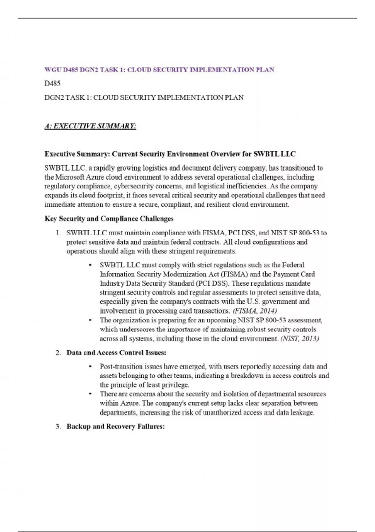 WGU D485 DGN2 TASK 1: CLOUD SECURITY IMPLEMENTATION PLAN | Latest 2025 Update with complete solutions.