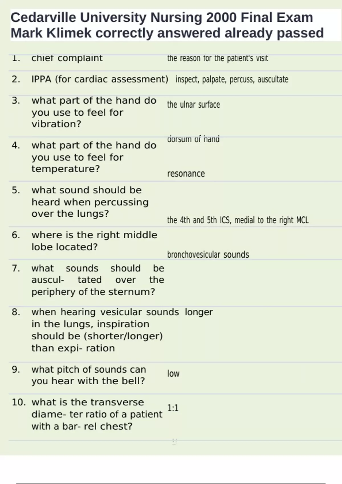 , Cedarville University Nursing 2000 Final Exam
