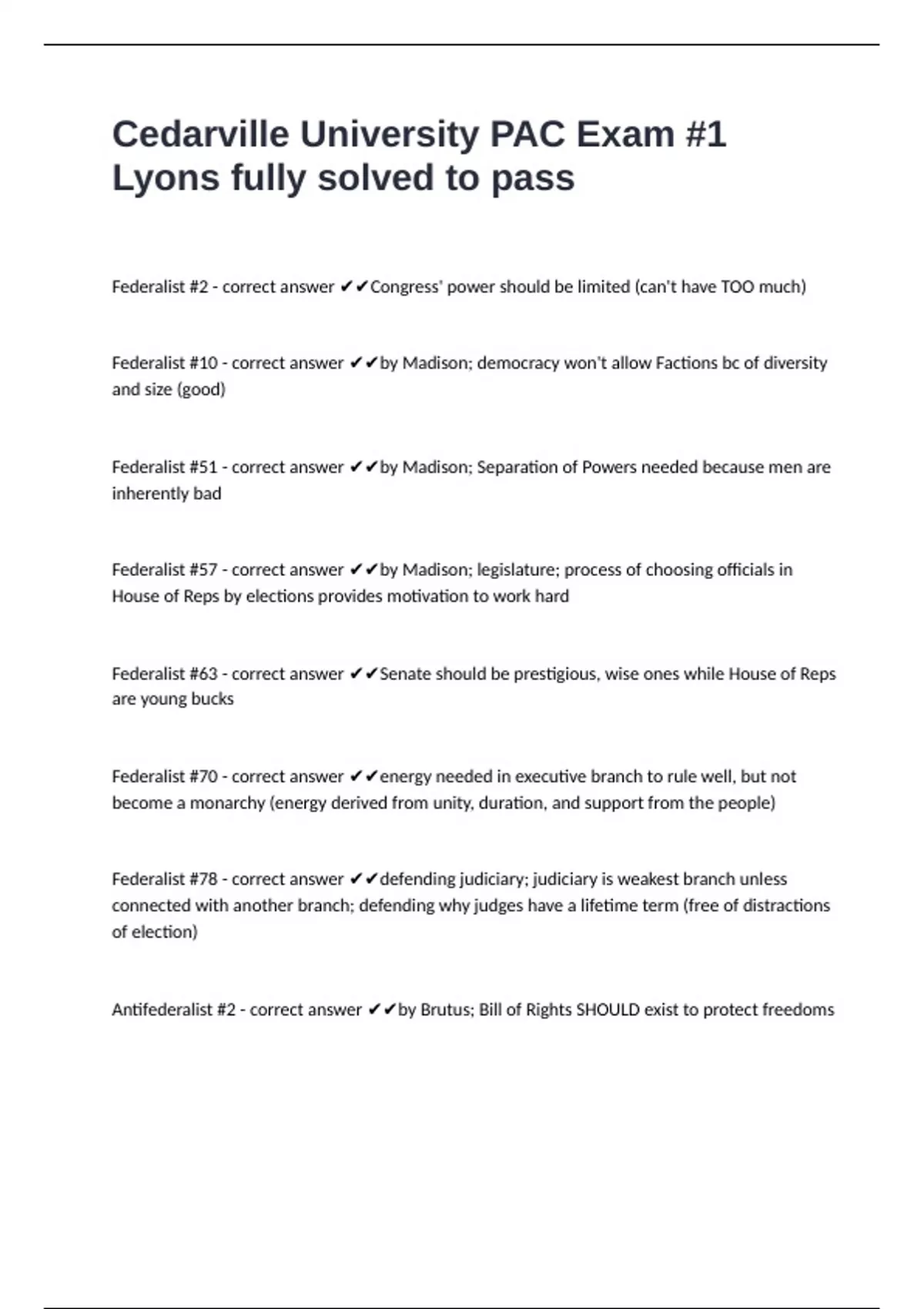 Federalist #2 - correct answer ✔✔Congress' power should be limited (can't have TOO much)