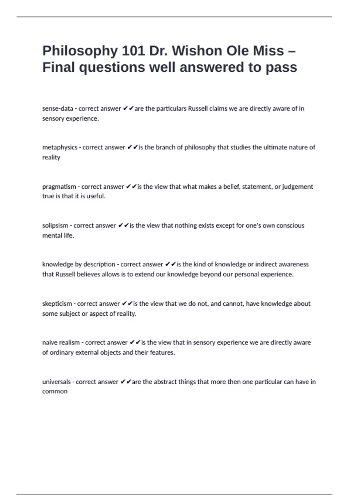 Philosophy 101 Dr. Wishon Ole Miss – Final questions well answered to pass