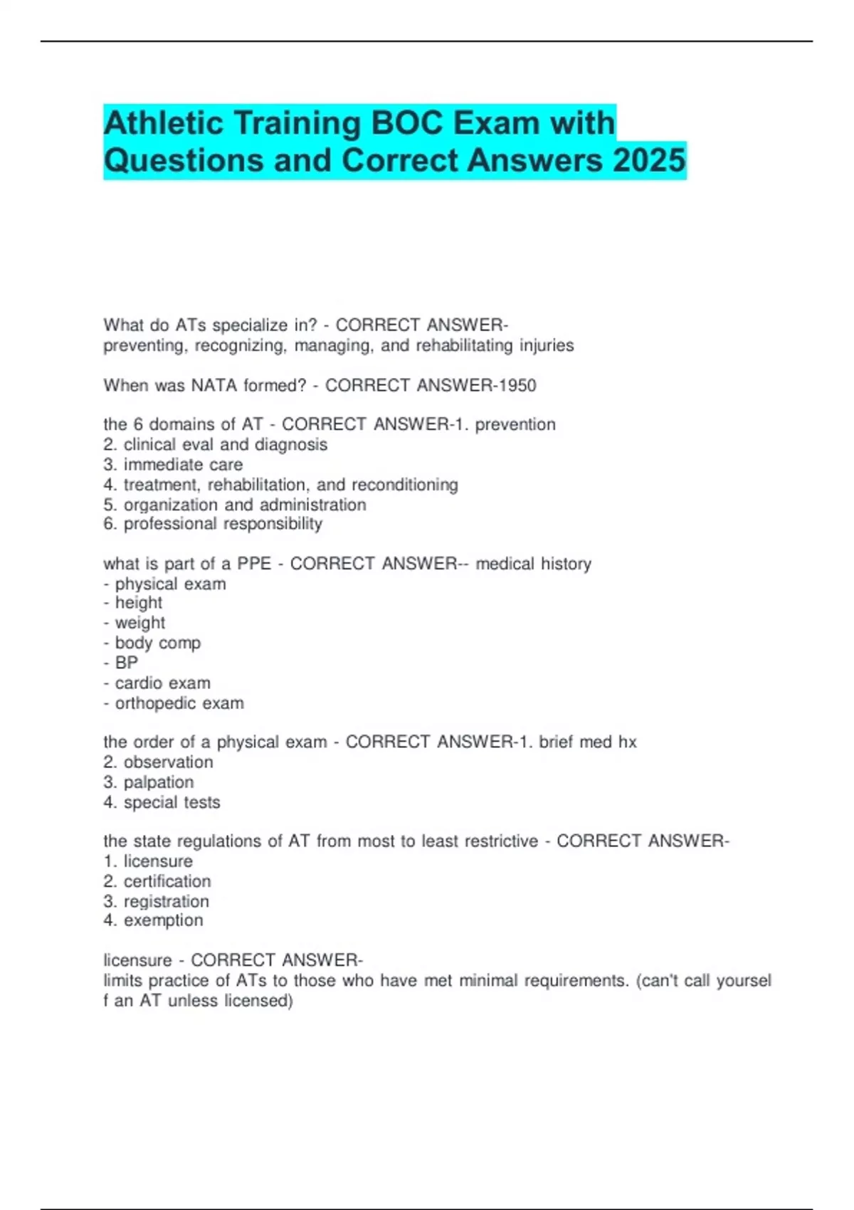 Athletic Training BOC Exam with Questions and Correct Answers 2025.
